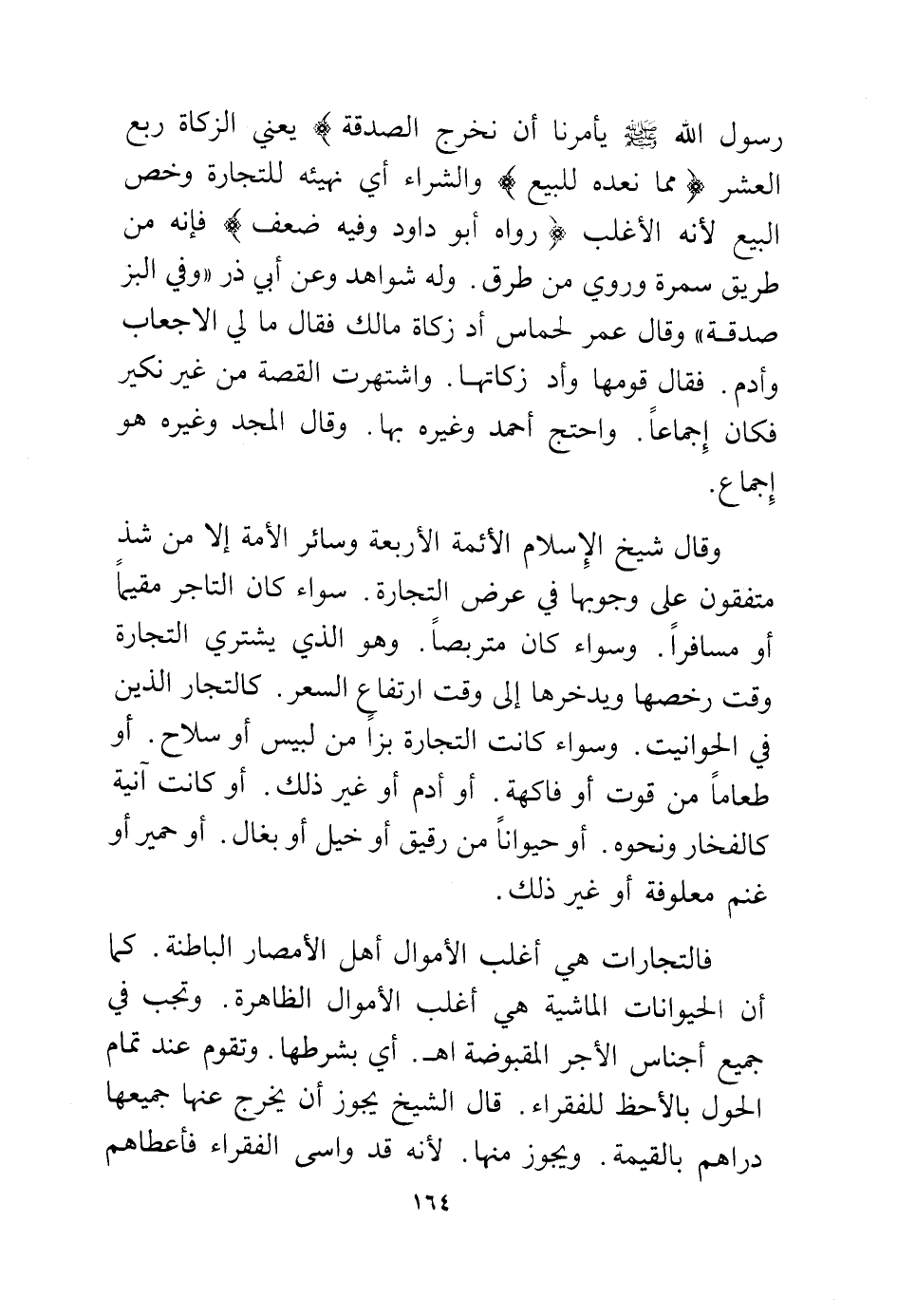 وقال شيخ الإسلام الأئمة الأربعة وسائر الأمم إلا من شذ متفقون على وجوبها في عرض التجارة. سواء كان التاجر مقيما أو مسافر وسواء كان متربصا. وهو الذي يشتري التجارة وقت رخصها ويدخرها إلى وقت ارتفاع السعر. كالتجار الذين في الحوانيت. وسواء كانت التجارة بزا من لبيس أو سلاح. أو طعاما من قوت أو فاكهة. أو أدم أو غير ذلك. أو كانت آنية كالفخار ونحوه. أو حيوانا من رقيق أو خيل أو بغال. أو حمير أو غنم معلوفة أو غير ذلك.