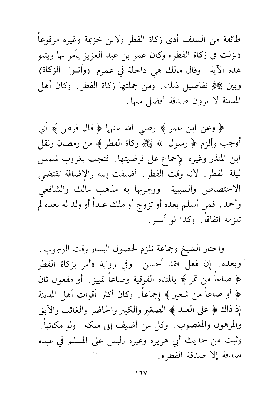 واختار الشيخ وجماعة تلزم لحصول اليسار وقت الوجوب. وبعده. إن فعل فقد أحسن. وفي رواية "أمر بزكاة الفطر (صاعا من تمر) بالمثناة الفوقية وصاعا تمييز. أو مفعول ثان (أو صاعا من شعير) إجماعا. وكان أكثر أقوات أهل المدينة إذا ذاك (على العبد) الصغير والكبير والحاضر والغائب والآبق والمرهون والمغصوب. وكل من أضيف إلى ملكه. ولو مكاتبا.