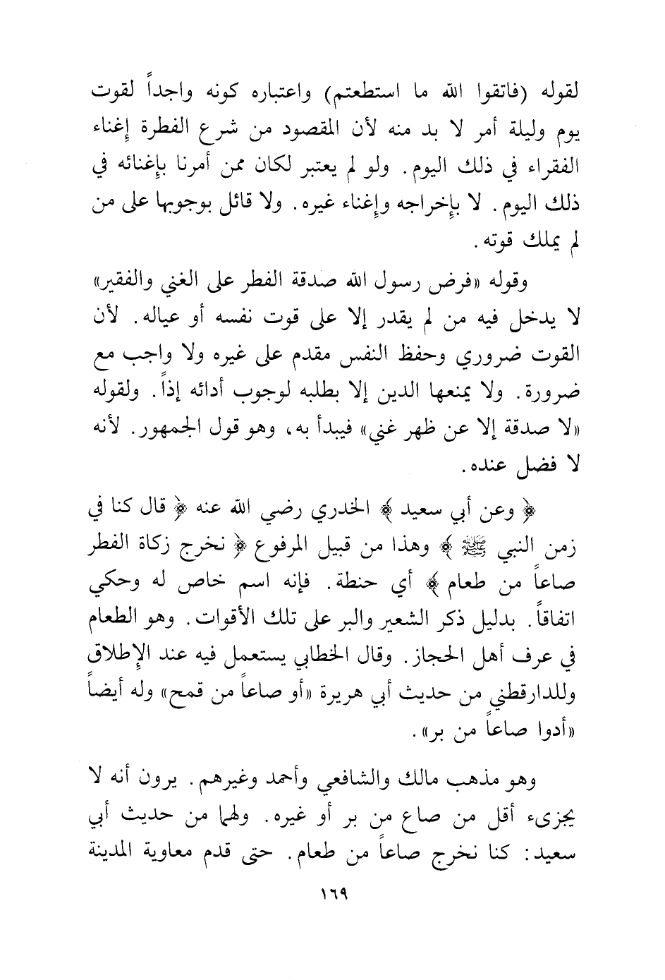 وهو مذهب مالك والشافعي وأحمد وغيرهم. يرون أنه لا يجزئ أقل من صاع من بر أو غيره. ولهما من حديث أبي سعيد: كنا نخرج صاعًا من طعام. حتى قدم معاوية المدينة