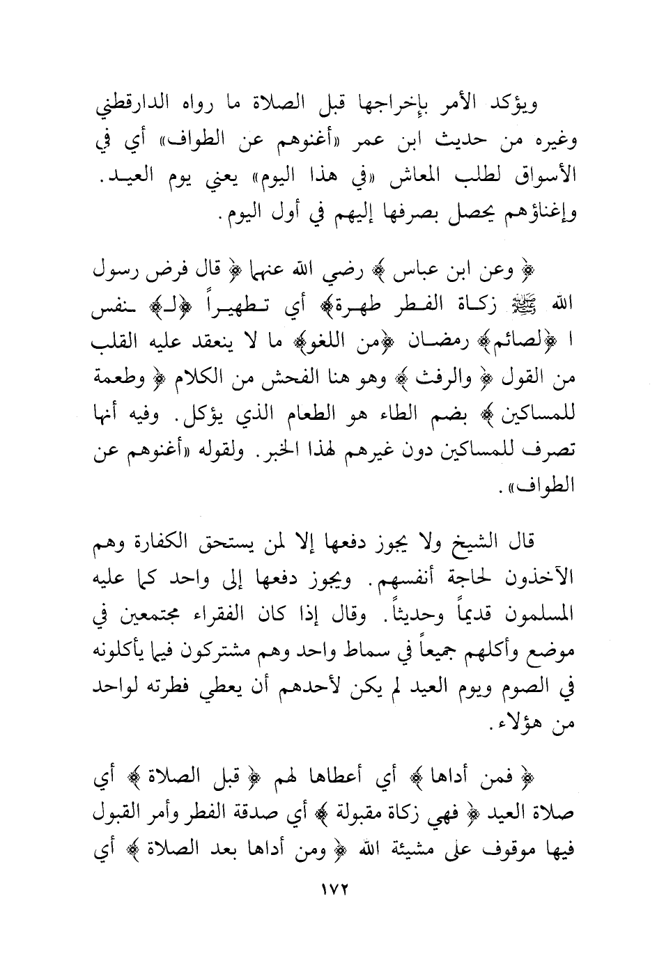 ويؤكد الأمر بإخراجها قبل الصلاة ما رواه الدارقطني وغيره من حديث ابن عمر "أغنوهم عن الطواف" أي في الأسواق لطلب المعاش "في هذا اليوم" يعني يوم العيد. وإغناؤهم يحصل بصرفها إليهم في أول اليوم.