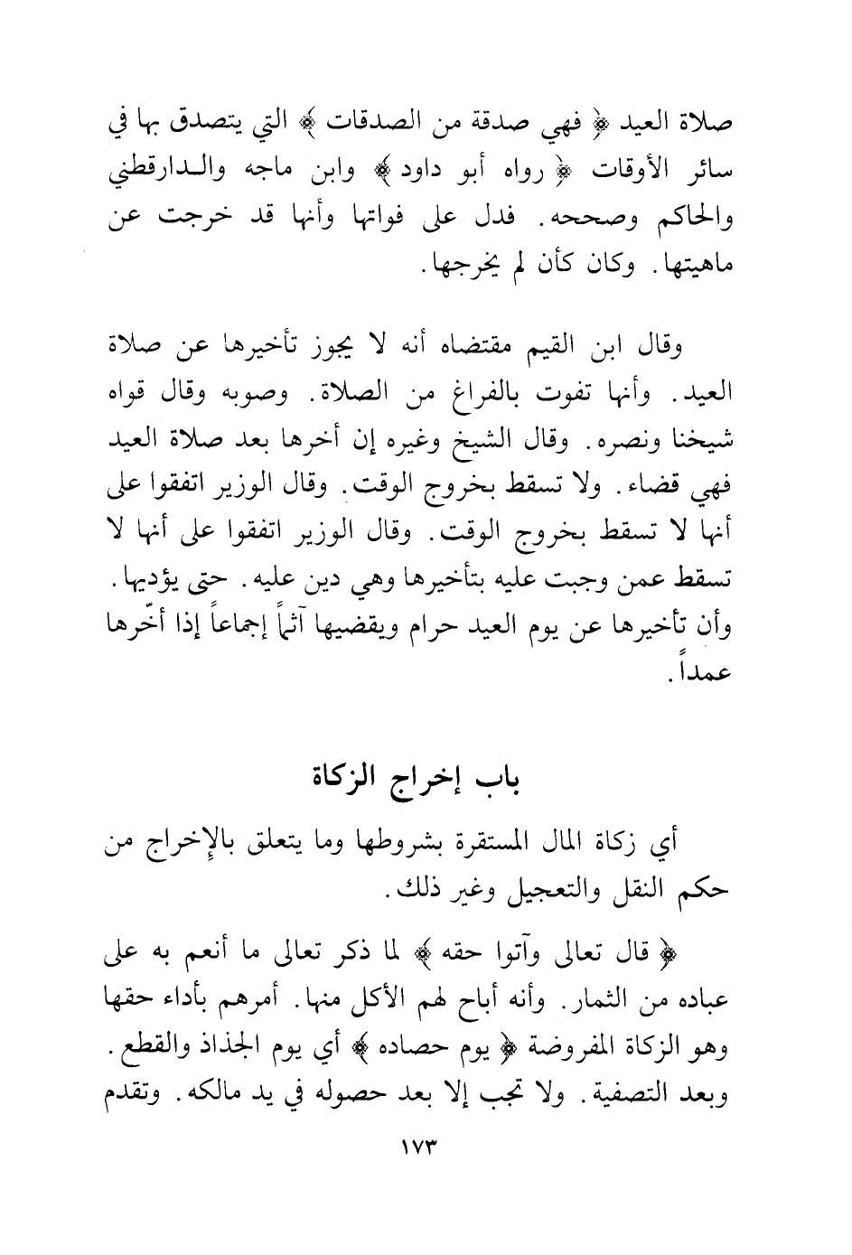 وقال ابن القيم مقتضاه أنه لا يجوز تأخيرها عن صلاة العيد. وأنها تفوت بالفراغ من الصلاة. وصوبه وقال قواه شيخنا ونصره. وقال الشيخ وغيره إن أخرها بعد صلاة العيد فهي قضاء. ولا تسقط بخروج الوقت. وقال الوزير اتفقوا على أنها لا تسقط بخروج الوقت وقال الوزير اتفقوا على أنها لا تسقط عمن وجبت عليه بتأخيرها وهي دين عليه. حتى يؤديها. وأن تأخيرها عن يوم العيد حرام ويقضيها آثما إجماعا إذا أخرها عمدًا.
