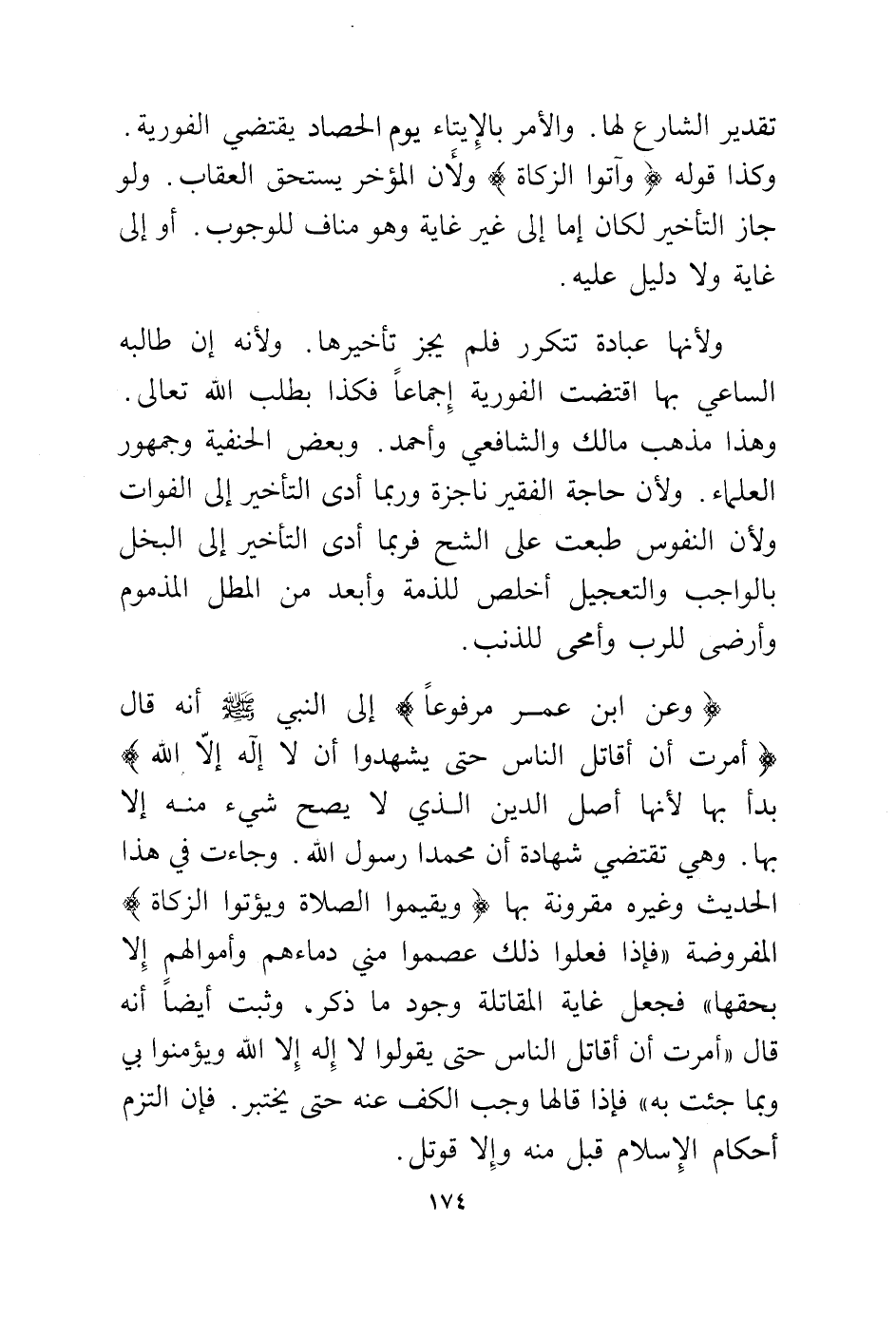 (عن ابن عمر مرفوعا) إلى النبي - صلى الله عليه وسلم - أنه قال (أمرت أن أقاتل الناس حتى يشهدوا أن لا إله إلا الله) بدأ بها لأنها أصل الدين الذي لا يصح شيء منه إلا بها. وهي تقتضي شهادة أن محمدا رسول الله. وجاءت في هذا الحديث وغيره مقرونة بها {وَيُقِيمُوا الصَّلَاةَ وَيُؤْتُوا الزَّكَاةَ} المفروضة "فإذا فعلوا ذلك عصموا مني دماءهم وأموالهم إلا بحقها" فجعل غاية المقاتلة وجود ما ذكر. وثبت أيضا أنه قال "أمرت أن أقاتل الناس حتى يقولوا لا إله إلا الله ويؤمنوا بي وبما جئت به" فإذا قالها وجب الكف عنه حتى يختبر. فإن التزم أحكام الإسلام قبل منه وإلا قوتل.