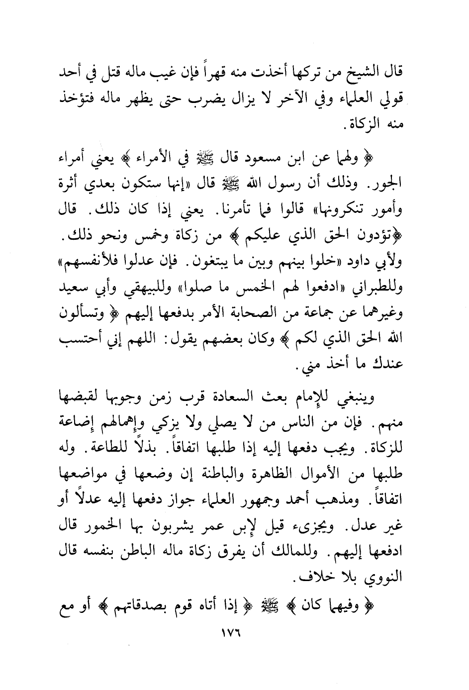 وينبغي للإمام بعث السعادة قرب زمن وجوبها لقبضها منهم. فإن من الناس من لا يصلي ولا يزكي وإهمالهم إضاعة للزكاة. ويجب دفعها إليه إذا طلبها اتفاقا. بذلا للطاعة. وله طلبها من الأموال الظاهرة والباطنة إن وضعها في مواضعها اتفاقا. ومذهب أحمد وجمهور العلماء جواز دفعها إليه عدلاً أو غير عدل. ويجزئ قيل لابن عمر يشربون بها الخمور قال ادفعها إليه. وللمالك أن يفرق زكاة ماله الباطن بنفسه قال النووي بلا خلاف.