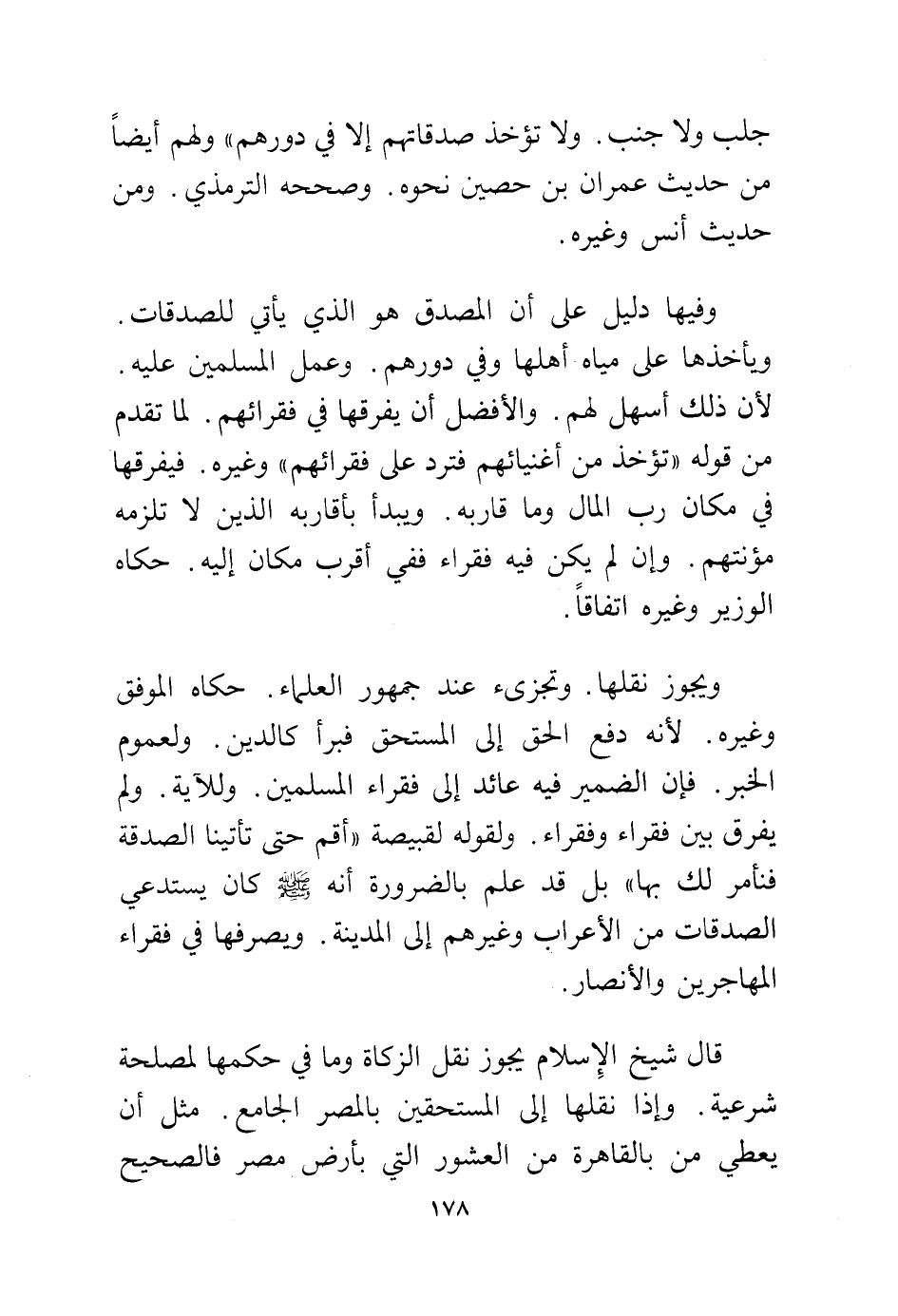 ويجوز نقلها وتجزئ عند جمهور العلماء. حكاه الموفق وغيره. لأنه دفع الحق إلى المستحق فبرأ كالدين. ولعموم الخبر. فإن الضمير فيه عائد إلى فقراء المسلمين. وللآية. ولم يفرق بين فقراء وفقراء. ولقوله لقبيصة "أقم حتى تأتينا الصدقة فنأمر لك بها" بل قد علم بالضرورة أنه - صلى الله عليه وسلم - كان يستدعي الصدقات من الأعراب وغيرهم إلى المدينة. ويصرفها في فقراء المهاجرين والأنصار.