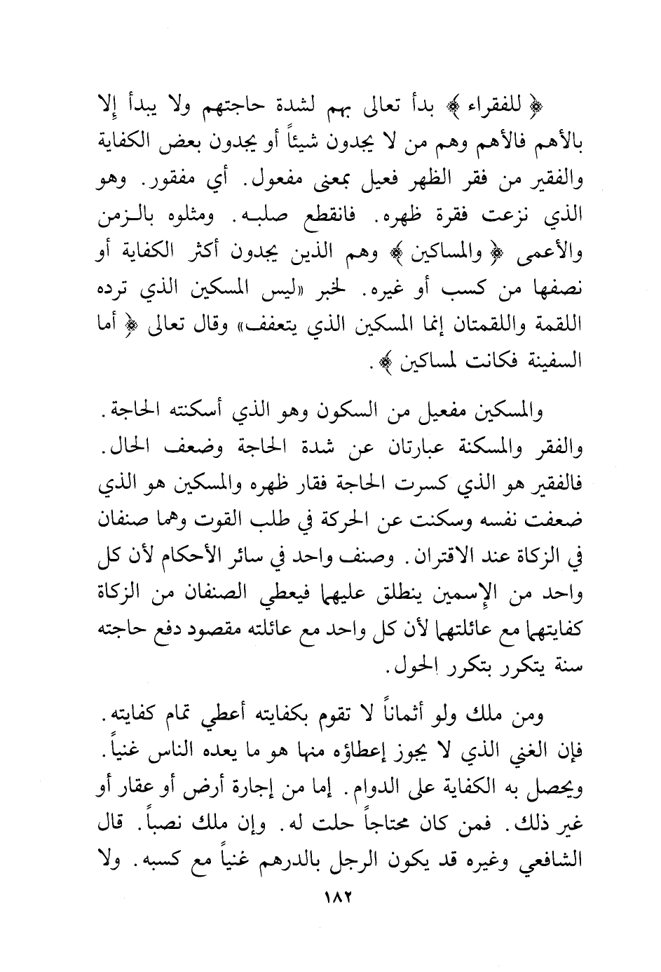 {لِلْفُقَرَاءِ} بدأ تعالى بهم لشدة حاجاتهم ولا يبدأ إلا بالأهم فالأهم وهم من لا يجدون شيئا أو يجدون بعض الكفاية والفقير من فقر الظهر فعيل بمعنى مفعول. أي مفقور. وهو الذي نزعت فقرة ظهره. فانقطع صلبه. ومثلوه بالزمن والأعمى (وَالْمَسَاكِينَ) وهم الذين يجدون أكثر الكفاية أو نصفها من كسب أو غيره. لخبر "ليس المسكين الذي ترده اللقمة واللقمتان إنما المسكين الذي يتعفف" وقال تعالى {أَمَّا السَّفِينَةُ فَكَانَتْ لِمَسَاكِينَ}.