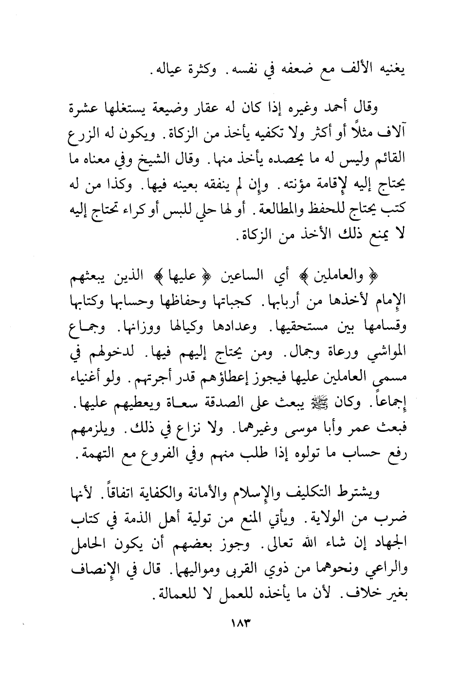 وقال أحمد وغيره إذا كان له عقار وضيعة يستغلها عشرة آلاف مثلا أو أكثر ولا تكفيه يأخذ من الزكاة. ويكون له الزرع القائم وليس له ما يحصده يأخذ منها. وقال الشيخ وفي معناه ما يحتاج إليه لإقامة مؤنته. وإن لم ينفقه بعينه فيها. وكذا من له كتب يحتاج للحفظ والمطالعة. أول لها حلي للبس أو كراء تحتاج إليه لا يمنع ذلك الأخذ من الزكاة.