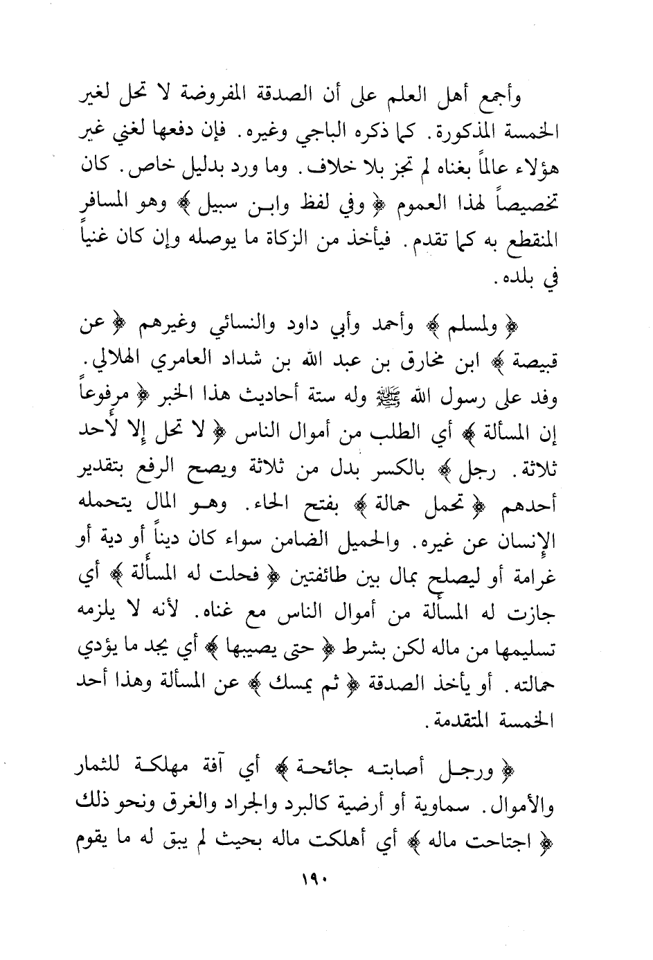 (ولمسلم) وأحمد وأبي داود والنسائي وغيرهم (عن قبيصة) ابن مخارق بن عبد الله بن شداد العامري الهلالي. وفد على رسول الله - صلى الله عليه وسلم - وله ستة أحاديث هذا الخبر (مرفوعا إن المسألة) أي الطلب من أموال الناس (لا تحل إلا لأحد ثلاثة رجل) بالكسر بدل من ثلاثة ويصح الرفع بتقدير أحدهم (تحمل حمالة) بفتح الحاء. وهو المال يتحمله الإنسان عن غيره. والحميل الضامن سواء كان دينا أو دية أو غرامة أو ليصلح بمال بين طائفتين (فحلت له المسألة) أي جازت له المسألة من أموال الناس مع غناه. لأنه لا يلزمه تسليمها من ماله لكن بشرط (حتى يصيبها) أي يجد ما يؤدي حمالته. أو يأخذ الصدقة (ثم يمسك) عن المسألة وهذا أحد الخمسة المتقدمة.