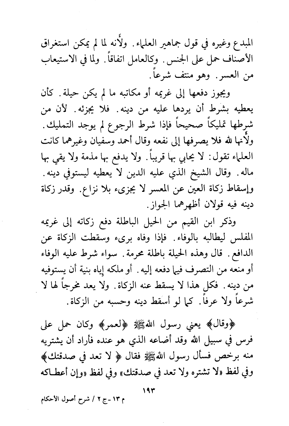 المبدع وغيره في قول جماهير العلماء. ولأنه لما لم يمكن استغراق الأصناف حمل على الجنس. وكالعامل اتفاقا. ولما في الاستيعاب من العسر. وهو منتف شرعا. ويجوز دفعها لى غريمه أو مكاتبه ما لم يكن حيلة. كأن يعطيه بشرط أن يردها عليه من دينه. فلا يجزئه. لأن من شرطها تمليكا صحيحا فإذا شرط الرجوع لم يوجد التمليك. ولأنها لله فلا يصرفها على نفعه وقال أحمد وسفيان وغيرهما كانت العلماء تقول: لا يحابي بها قريبا. ولا يدفع بها مذمة ولا يقي بها ماله. وقال الشيخ الذي عليه الدين لا يعطيه ليستوفي دينه. وإسقاط زكاة العين عن المعسر لا يجزئ بلا نزاع. وقدر زكاة دينه فيه قولان أظهرهما الجواز.