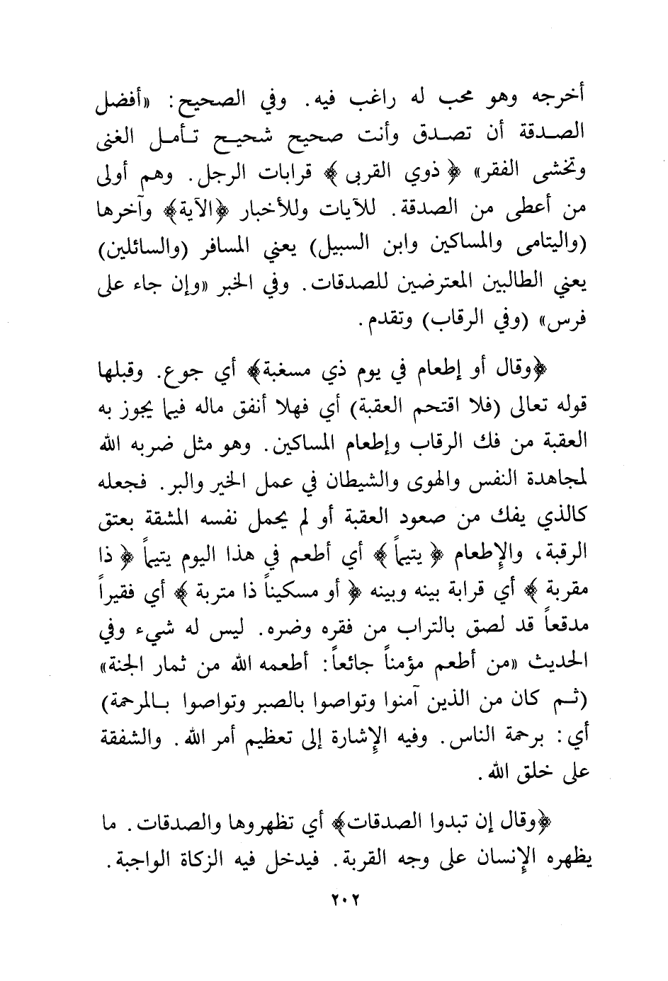 وقال {أَوْ إِطْعَامٌ فِي يَوْمٍ ذِي مَسْغَبَةٍ} أي جوع. وقلبها قوله تعالى: {فَلَا اقْتَحَمَ الْعَقَبَةَ} أي فهلا أنفق ماله فيما يجوز به العقبة من فك الرقاب وإطعام المساكين. وهو مثل ضربه الله لمجاهدة النفس والهوى والشيطان في عمل الخير والبر. فجعله كالذي يفك من صعود العقبة أو لم يحمل نفسه المشقة بعتق الرقبة. والإطعام (يتيما) أي أطعم في هذا اليوم يتيما (ذا مقربة) اي قرابة بينه وبينه (أو مسكينا ذا متربة) أي فقيرا مدقعا قد لصق بالتراب من فقره وضره. ليس له شيء وفي الحديث "من أعطم مؤمنا جائعا: أطعمه الله من ثمار الجنة" {ثُمَّ كَانَ مِنَ الَّذِينَ آمَنُوا وَتَوَاصَوْا بِالصَّبْرِ وَتَوَاصَوْا بِالْمَرْحَمَةِ} أي: برحمة الناس. وفيه الإشارة إلى تعظيم أمر الله. والشفقة على خلق الله.