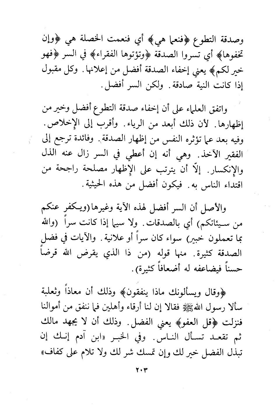 وقال {وَيَسْأَلُونَكَ مَاذَا يُنْفِقُونَ} وذلك أن معاذا وثعلبة سألا رسول الله - صلى الله عليه وسلم - فقالا إن لنا أرقاء وأهلين فما ننفق من أموالنا فنزلت {قُلِ الْعَفْوَ} يعني الفضل. وذلك أن لا يجهد مالك ثم تقعد تسأل الناس. وفي الخبر "ابن آدم إنك إن تبذل الفضل خير لك وإن تمسك شر لك ولا تلام على كفاف"