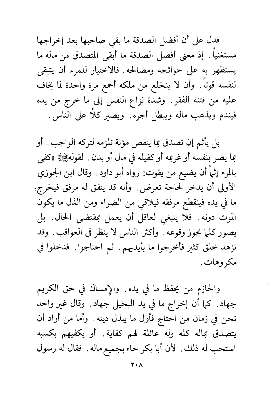 بل يأثم إن تصدق بما ينقص مؤنة تلزمه لتركه الواجب. أو بما يضر بنفسه أو غريمه أوكفيله في مال أو بدن. لقوله - صلى الله عليه وسلم - "كفى بالمرء إثما أن يضيع من يفوت" رواه أبو داود. وقال ابن الجوزي الأولى أن يدخر لحاجة تعرض. وأنه قد يتفق له مرفق فيخرج: ما في يده فينقطع مرفقه فيلاقي من الضراء ومن الذل ما يكون الموت دونه. فلا ينبغي لعاقل أن يعمل بمقتضى الحال. بل يصور كلما يجوز وقوعه. وأكثر الناس لا ينظر في العواقب. وقد تزهد خلق كثير فأخرجوا ما بأيديهم. ثم احتجاجوا. فدخلوا في مكروهات.