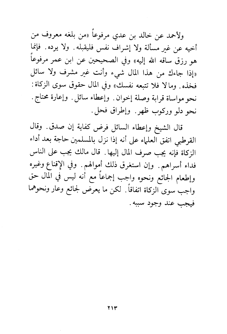قال الشخ وإعطاء السائل فرض كفاية إن صدق. وقال القرطبي اتفق العلماء علىنه إذا نزل بالمسلمين حاجة بعد أداء الزكاة فإنه يجب صرف المال إليها. قال مالك يجب على الناس فداء أسرهم. وإن استغرق ذلك أموالهم. وفي الإقناع وغيره وإطعام الجائع ونحوه واجب إجماعا مع أنه ليس في المال حق واجب سوى الزكاة اتفاقا. لكن ما يعرض لجائع وعار ونحوهما فيجب عند وجود سببه.