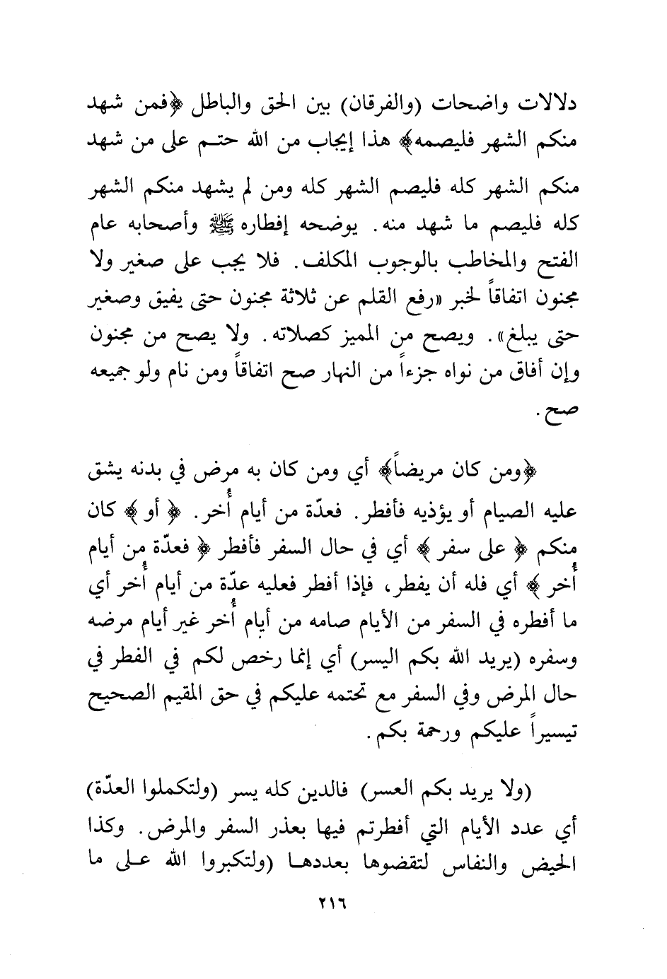 دلالات واضحات (والفرقان) بين الحق والباطل {فَمَنْ شَهِدَ مِنْكُمُ الشَّهْرَ فَلْيَصُمْهُ} هذا إيجاب من الله ختم على من شهد منكم الشهر كله فليصم الشهر كله ومن لم يشهد منكم الشهر كله فليصم ما شهد منه. يوضحه إفطاره - صلى الله عليه وسلم - وأصحابه عام الفتح والمخاطب بالوجوب المكلف. فلا يجب على صغير ولا مجنون اتفاقا لخبر "رفع القلم عن ثلاثة مجنون حتى يفيق وصغير حتى يبلغ". ويصح من المميز كصلاته. ولا يصح من مجنون وإن أفاق من نواه جزءامن النهار صح اتفاقا ومن نام ولو جميعه صح.