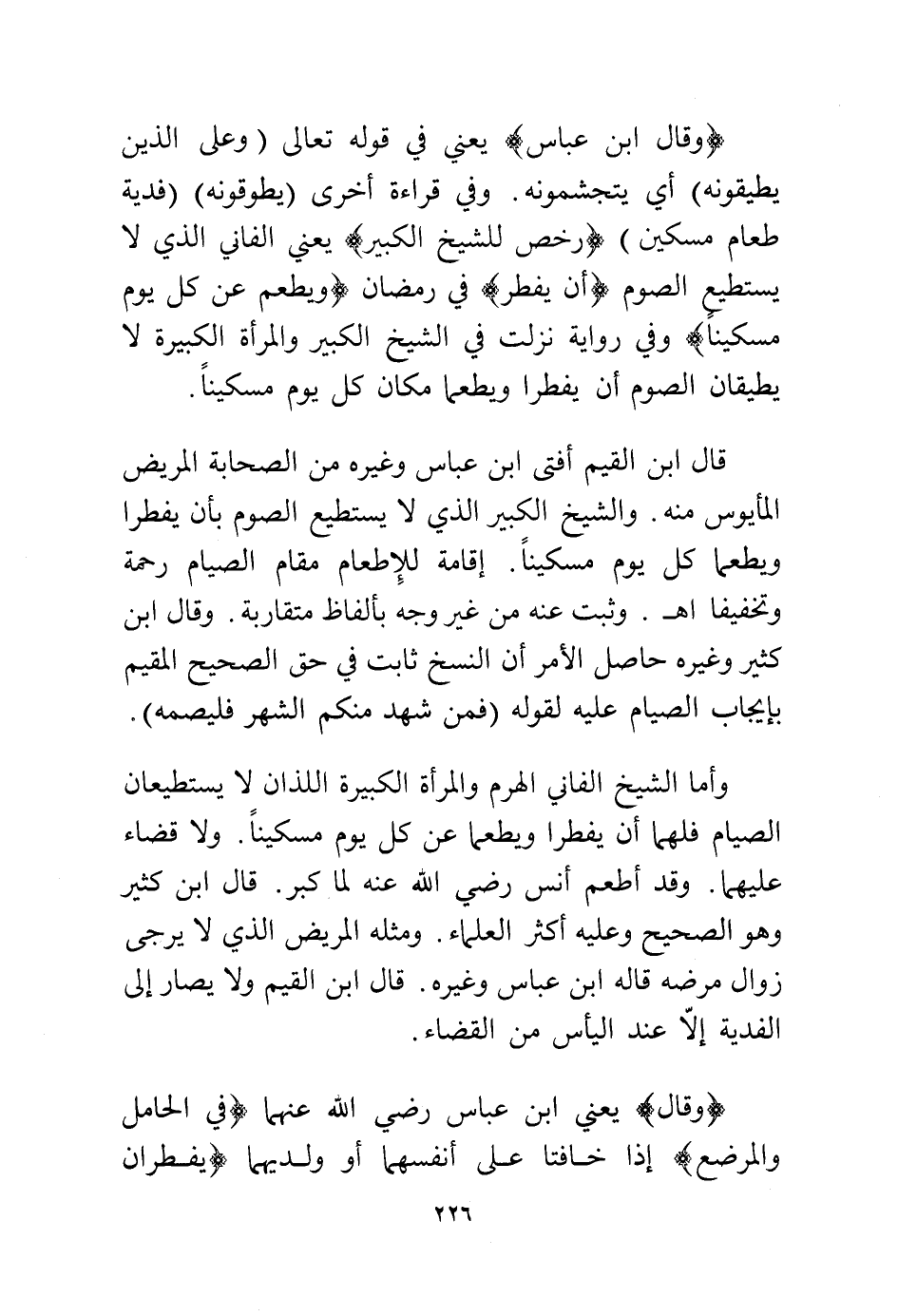 (وقال ابن عباس) يعني في قوله تعالى: {وَعَلَى الَّذِينَ يُطِيقُونَهُ} أي يتجشمونه. وفي قراءة أخرى (يطوقونه) {فِدْيَةٌ طَعَامُ مِسْكِينٍ} (رخص للشيخ الكبير) يعني الفاني الذي لا يستطيع الصوم (أن يفطر) في رمضان (ويطعم عن كل يوم مسكينا) وفي رواية نزلت في الشيخ الكبير والمرأة الكبيرة لا يطيقان الصوم أن يفطرا ويطعما مكان كل يوم مسكينا.