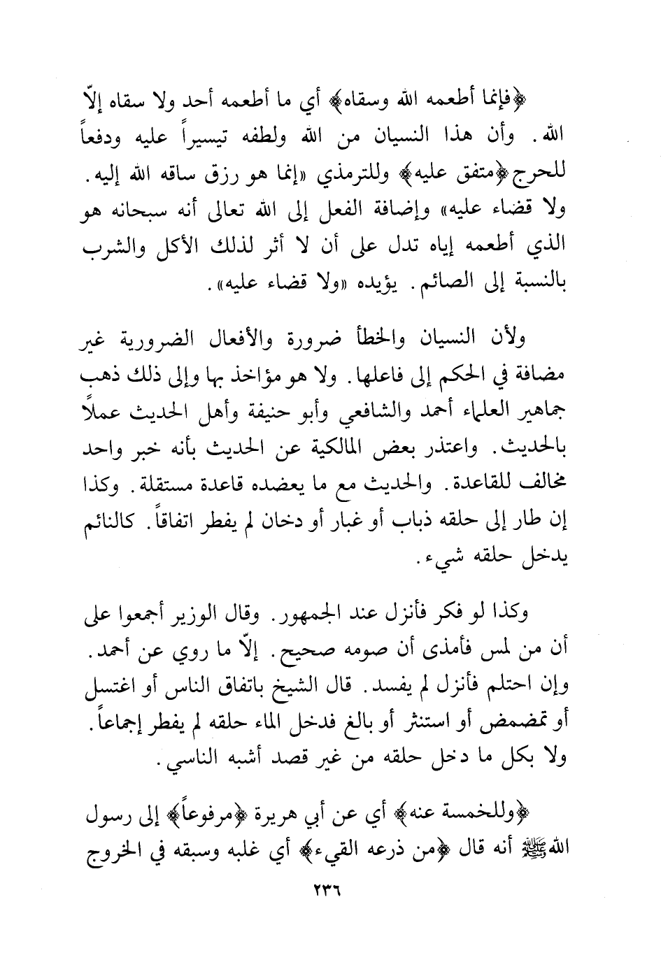 ولأن النسيان والخطأ ضرورة والأفعال الضرورية غير مضافة في الحكم إلى فاعلها. ولا هو مؤاخذ بها وإلى ذلك ذهب جماهير العلماء أحمد والشافعي وأبو حنيفة وأهل الحديث عملا بالحديث. واعتذر بعض المالكية عن الحديث بأنه خبر واحد مخالف للقاعدة. والحديث مع ما يعضده قاعدة مستقلة. وكذا إن طار إلى حلقه ذباب أو غبار أو دخان لم يفطر اتفاقا. كالنائم يدخل حلقه شيء.