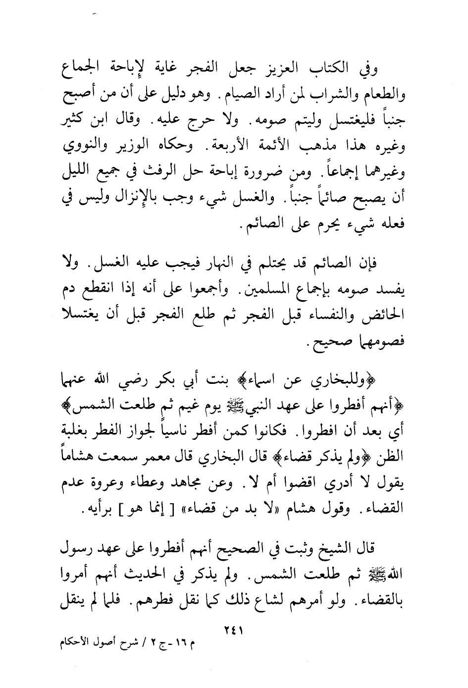 وفي الكتاب العزيز جعل الفجر غاية لإباحة الجماع والطعام والشراب لمن أراد الصيام. وهو دليل على أن من أصبح جنبًا فيغتسل وليتم صومه. ولا حرج عليه. وقال ابن كثير وغيره هذا مذهب الأئمة الأربعة. وحكاه الوزير والنووي وغيرهما إجماعًا. ومن ضرورة إباحة حل الرفث في جميع الليل أن يصبح صائمًا جنبًا. والغسل شيء وجب بالإنزال وليس في فعله شيء يحرم على الصائم.