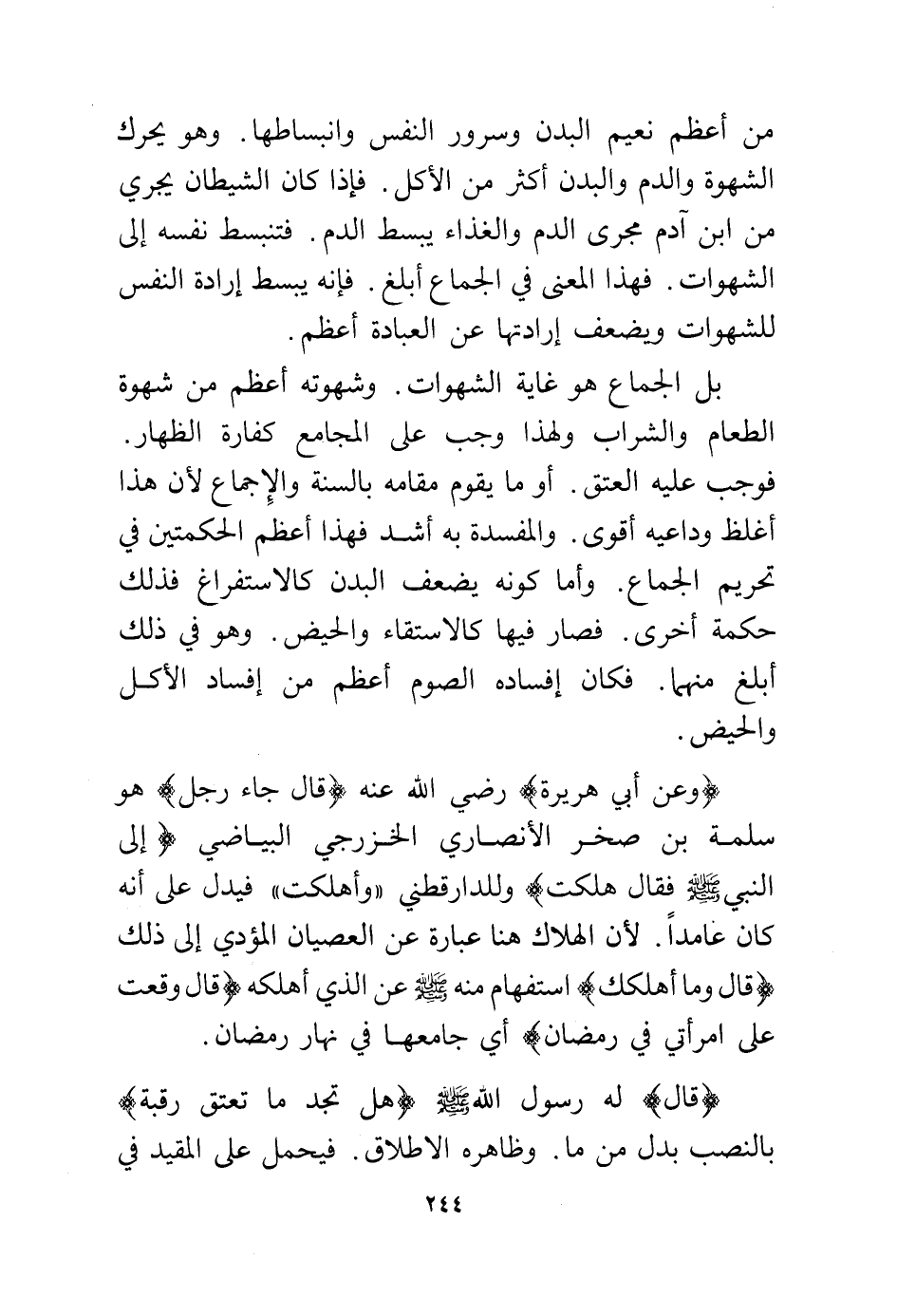 بل الجماع هو غاية الشهوات. وشهوته أعظم من شهوة الطعام والشراب ولهذا وجب على المجامع كفارة الظهار. فوجب عليه العتق. أو ما يقوم مقامه بالسنة والإجماع لأن هذا أغلظ وداعيه أقوى. والمفسدة به أشد فهذا أعظم الحكمتين في تحريم الجماع. وأما كونه يضعف البدن كالاستفراغ فذلك حكمة أخرى. فصار فيها كالاستقاء والحيض. وهو في ذلك أبلغ منهما. فكان إفساده الصوم أعظم من إفساد الأكل والحيض.