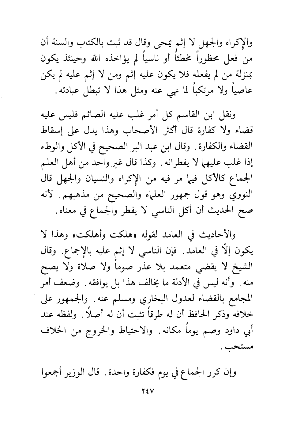 ونقل ابن القاسم كل أمر غلب عليه الصائم فليس عليه قضاء ولا كفارة قال أكثر الأصحاب وهذا يدل على إسقاط القضاء والكفارة. وقال ابن عبد البر الصحيح في الأكل والوطء إذا غلب عليهما لا يفطرانه. وكذا قال غير واحد من أهل العلم الجماع كالأكل فيما مر فيه من الإكراه والنسيان والجهل قال النووي وهو قول جمهور العلماء والصحيح من مذهبهم. لأنه صح الحديث أن أكل الناسي لا يفطر والجماع في معناه.