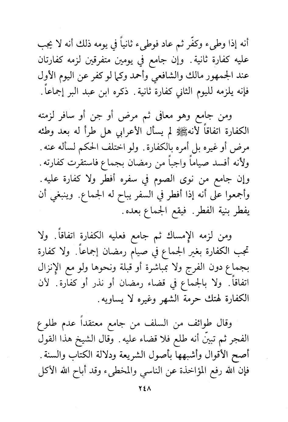 أنه إذا وطئ وكفر ثم عاد فوطئ ثانيًا في يومه ذلك أنه لا يجب عليه كفارة ثانية. وإن جامع في يومين متفرقين لزمه كفارتان عند الجمهور مالك والشافعي وأحمد وكما لو كفر عن اليوم الأول فإنه يلزمه لليوم الثاني كفارة ثانية. ذكره ابن عبد البر إجماعًا.