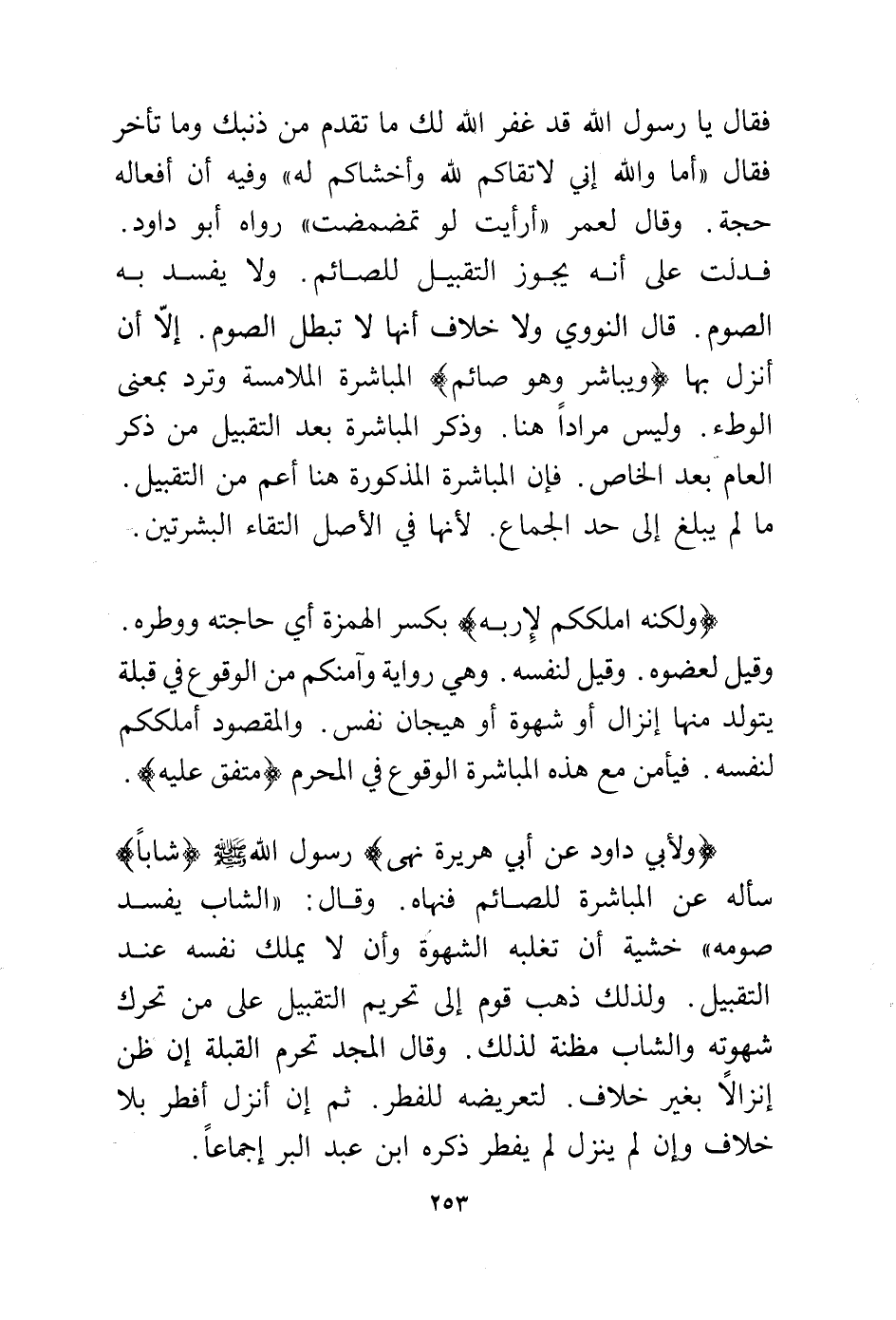 (ولأبي داود عن أبي هريرة نهى) رسول الله - صلى الله عليه وسلم - (شابا) سأله عن المباشرة للصائم فنهاه. وقال: "الشاب يفسد صومه" خشية أن تغلبه الشهوة وأن لا يملك نفسه عند التقبيل. ولذلك ذهب قوم إلى تحريم التقبيل على من تحرك شهوته الشاب مظنة لذلك. وقال المجد تحرم القبلة إن ظن إنزالا بغير خلاف. لتعريضه للفطر. ثم إن أنزل أفطر بلا خلاف وإن لم ينزل لم يفطر ذكره ابن عبد البر إجماعًا.