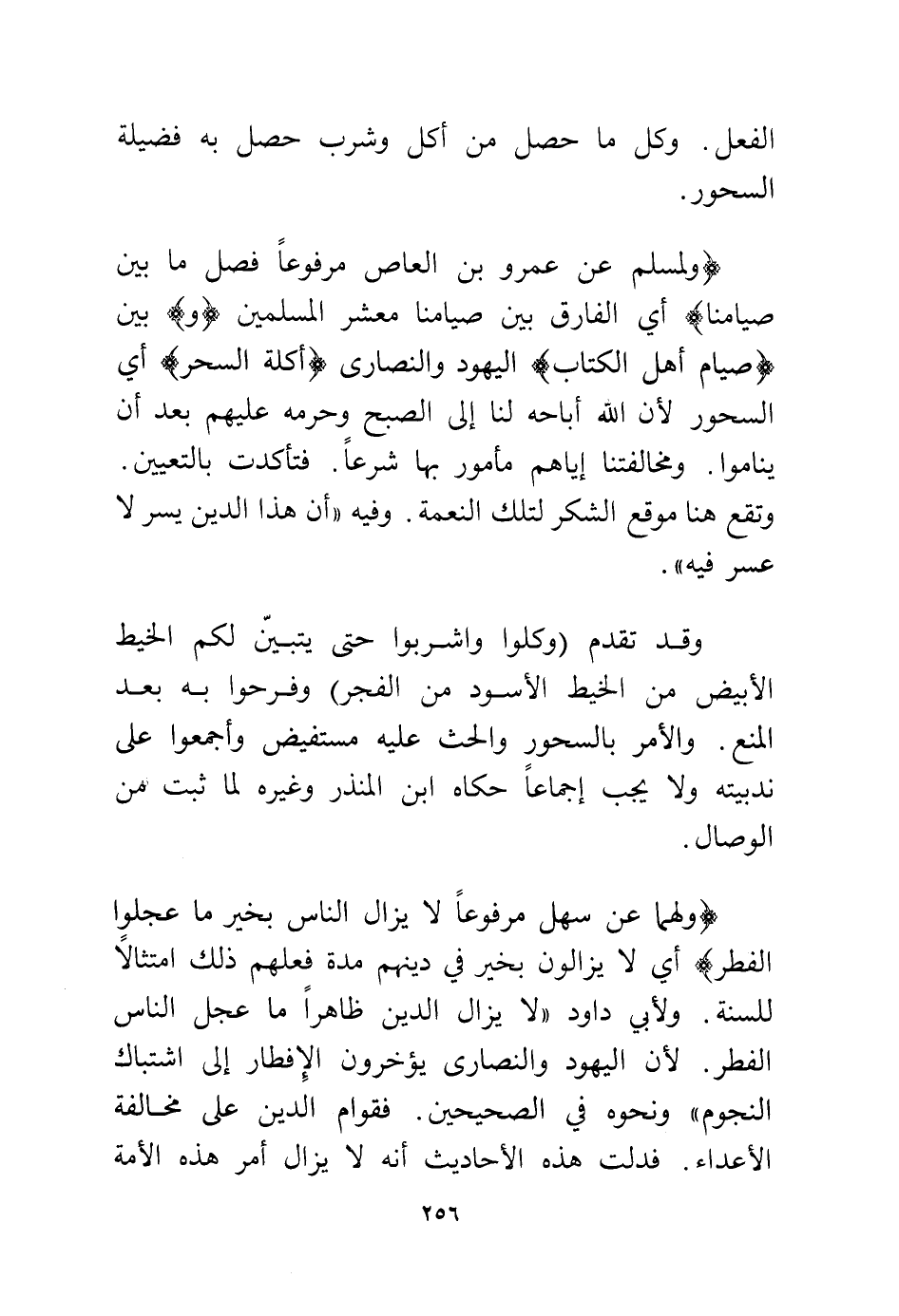 (ولمسلم عن عمرو بن العاص مرفوعًا فصل ما بين صيامنا) أي الفارق بين صيامنا معشر المسلمين (و) بين صيام أهل الكتاب) اليهود والنصارى (أكلة السحر) أي السحور لأن الله أباحه لنا إلى الصبح وحرمه عليهم بعد أن يناموا. ومخالفتنا إياهم مأمور بها شرعا. فتأكدت بالتعيين. وتقع هنا موقع الشكر لتلك النعمة. وفيه "أن هذا الدين يسر لا عسر فيه".