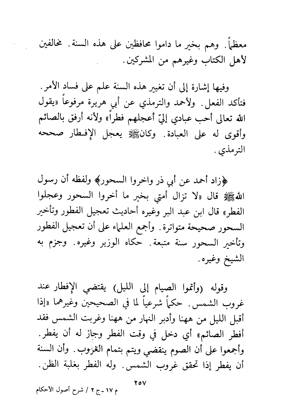 (زاد أحمد عن أبي ذر وأخروا السحور) ولفظه أن رسول الله - صلى الله عليه وسلم - قال "لا تزال أمتي بخير ما أخروا السحور وعجلوا الفطر" قال ابن عبد البر وغيره أحاديث تعجيل الفطور وتأخير السحور صحيحة متواترة. وأجمع العلماء علىن تجعيل الفطور وتأخير السحور سنة متبعة. حكاه الوزير وغيره. وجزم به الشيخ وغيره.