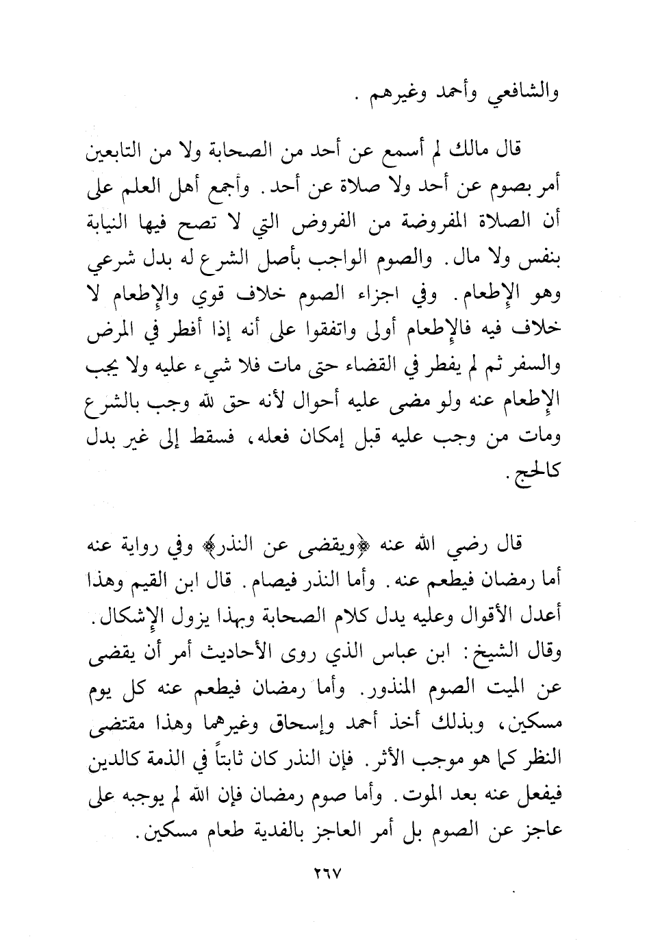 وقال الشيخ: ابن عباس الذي روى الأحاديث أمر أن يقضى عن الميت الصوم المنذور. وأما رمضان فيطعم عنه كل يوم مسكين. وبذلك أخذ أحمد وإسحاق وغيرهما وهذا مقتضى النظر كما هو موجب الأثر. فإن النذر كان ثابتا في الذمة كالدين فيفعل عنه بعد الموت. وأما صوم رمضان فإن الله لم يوجبه على عاجز عن الصوم بل أمر العاجز بالفدية طعام مسكين.