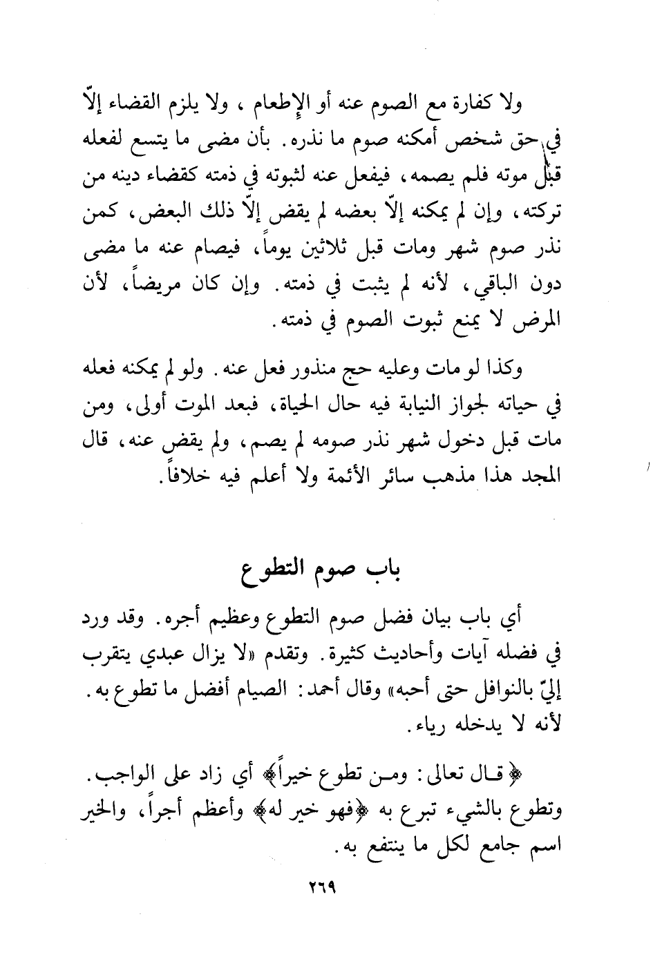ولا كفارة مع الصوم عنه أو الإطعام، ولا يلزم القضاء إلا في حق شخص أمكنه صوم ما نذره. بأن مضى ما يتسع لفعله قبل موته فلم يصمه، فيفعل عنه لثبوته في ذمته كقضاء دينه من تركته، وإن لم يمكنه إلا بعضه لم يقض إلا ذلك البعض، كمن نذر صوم شهر ومات قبل ثلاثين يومًا، فيصام عنه ما مضى دون الباقي، لأنه لم يثبت في ذمته. وإن كان مريضا. لأن المرض لا يمنع ثبوت الصوم في ذمته.
