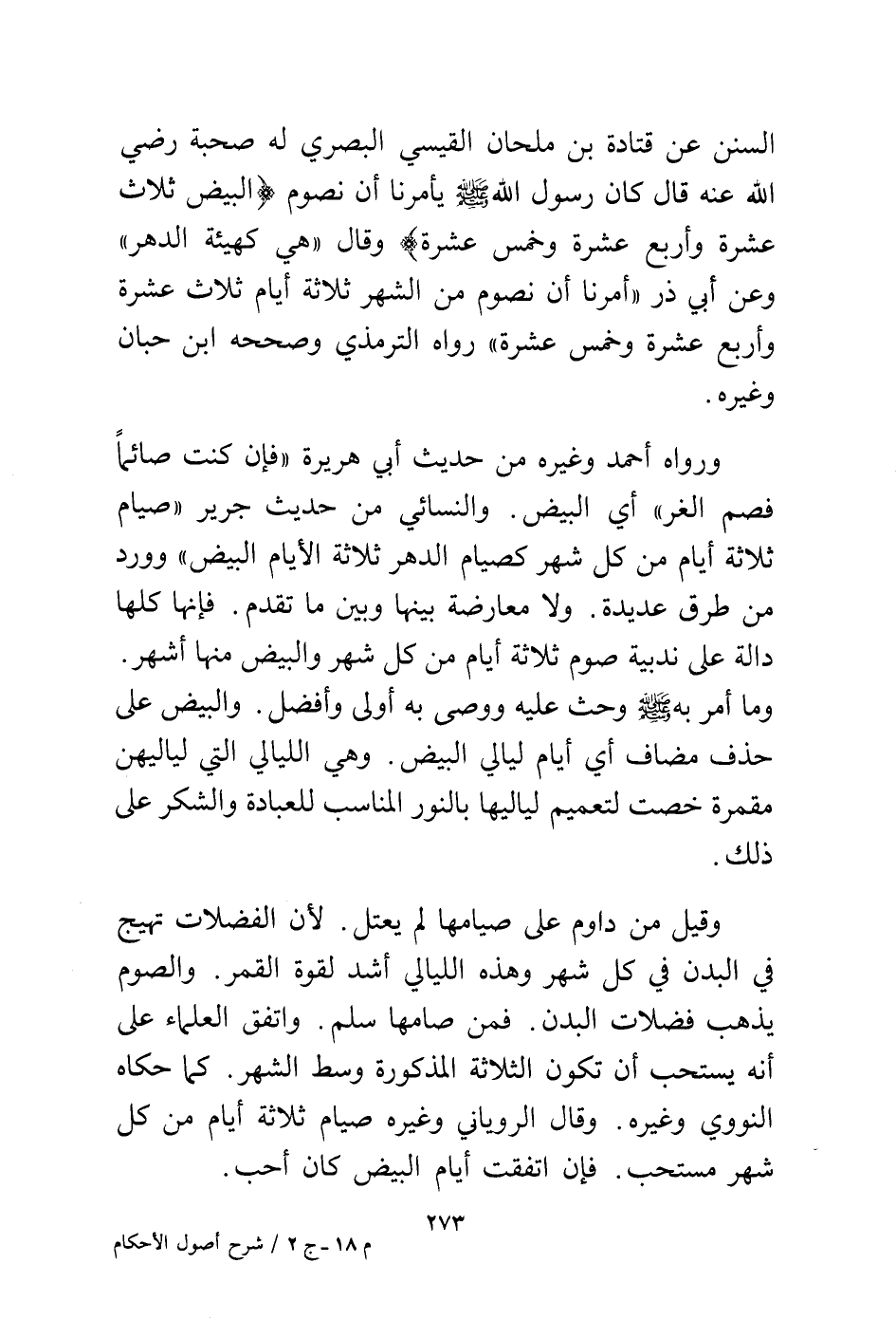 ورواه أحمد وغيره من حديث أبي هريرة "فإن كنت صائمًا فصم الغر" أي البيض. والنسائي من حديث جرير "صيام ثلاثة أيام من كل شهر كصيام الدهر ثلاثة الأيام البيض" وورد من طرق عديدة. ولا معارضة بينها وبين ما تقدم. فإنها كلها دالة على ندبية صوم ثلاثة أيام من كل شهر والبيض منها أشهر. وما أمر به - صلى الله عليه وسلم - وحث عليه ووصى به أولى وأفضل. والبيض على حذف مضاف أي أيام ليالي البيض. وهي الليالي التي لياليهن مقمرة خصت لتعميم لياليها بالنور المناسب للعبادة والشكر على ذلك.