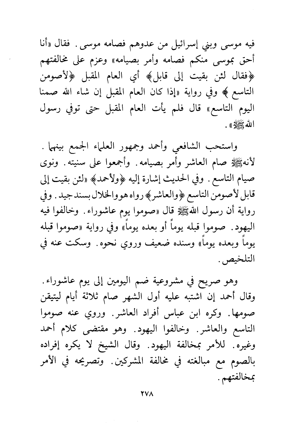 وهو صريح في مشروعية ضم اليومين إلى يوم عاشوراء. وقال أحمد إن اشتبه عليه أول الشهر صام ثلاثة أيام ليتيقن صومها. وكره ابن عباس أفراد العاشر. وروي عنه صوموا التاسع والعاشر. وخالفوا اليهود. وهو مقتضى كلام أحمد وغيره. للأمر بمخالفة اليهود. وقال الشيخ لا يكره إفراده بالصوم مع مبالغته في مخالفة المشركين. وتصريحه في الأمر