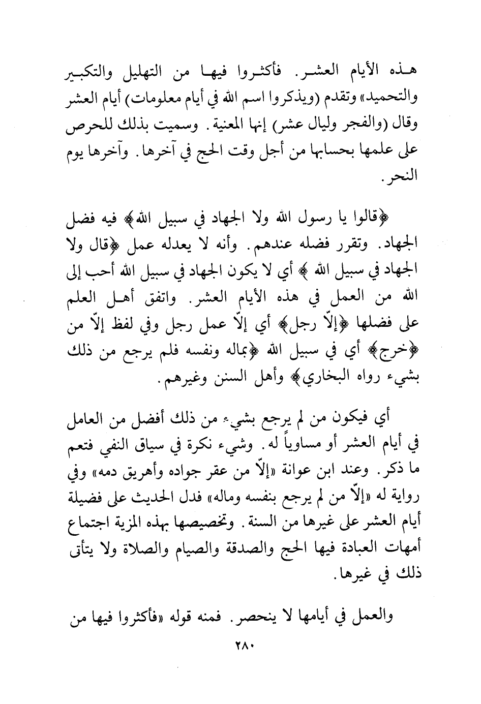 أي فيكون من لم يرجع بشيء من ذلك أفضل من العامل في أيام العشر أو مساويًا له. وشيء نكرة في سياق النفي فتعم ما ذكر. وعند ابن عوانة "إلا من عقر جواده وأهريق دمه" وفي رواية له "إلا من لم يرجع بنفسه وماله" فدل الحديث على فضيلة أيام العشر على غيرها من السنة. وتخصيصها بهذه المزية اجتماع أمهات العبادة فيها الحج والصدقة والصيام والصلاة ولا يتأتى ذلك في غيرها.