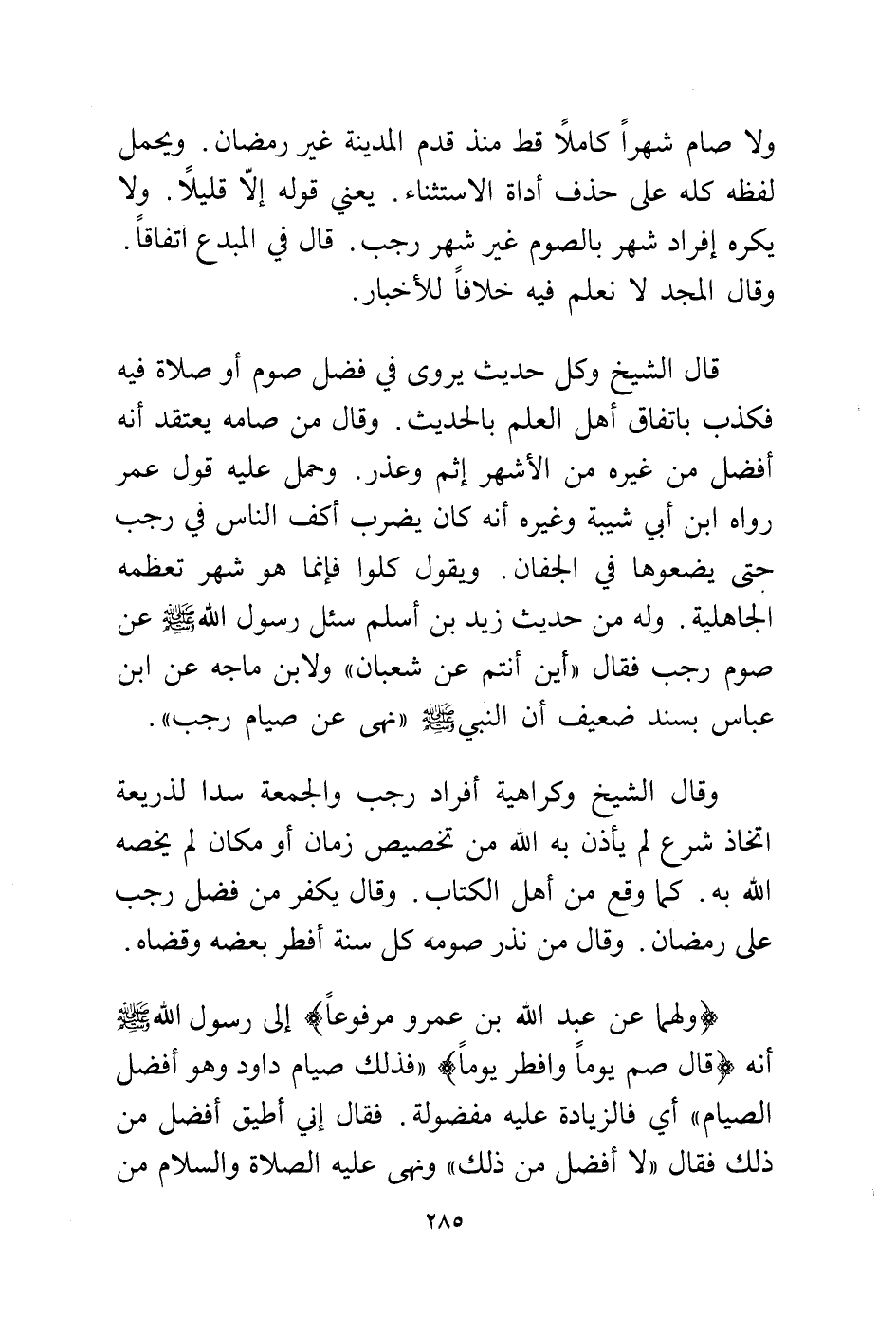 قال الشيخ وكل حديث يروى في فضل صوم أو صلاة فيه فكذب باتفاق أهل العلم بالحديث. وقال من صامه يعتقد أنه أفضل من غيره من الأشهر إثم وعذر. وحمل عليه قول عمر رواه ابن أبي شيبة وغيره أنه كان يضرب أكف الناس في رجب حتى يضعوها في الجفان. ويقول كلوا فإنما هو شهر تعظمه الجاهلية. وله من حديث زيد بن أسلم سئل رسول الله - صلى الله عليه وسلم - عن صوم رجب فقال "أين أنتم عن شعبان؟ " ولابن ماجه عن ابن عباس بسند ضعيف أن النبي - صلى الله عليه وسلم - "نهى عن صيام رجب".