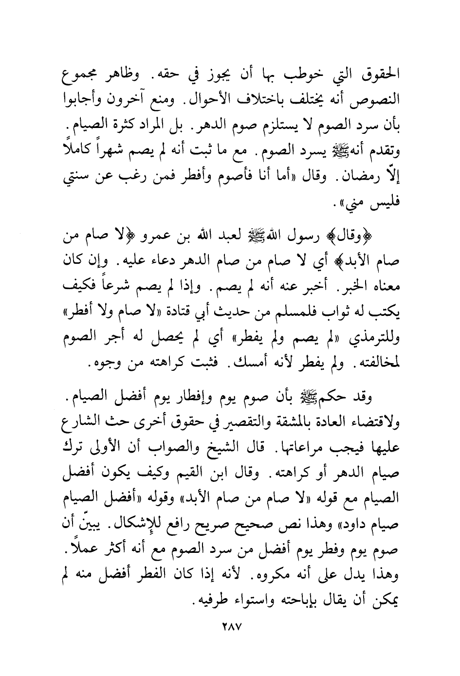 الحقوق التي خوطب بها أن يجوز في حقه وظاهر مجموع النصوص أنه يختلف باختلاف الأحوال. ومنه آخرون وأجابوا بأن سرد الصوم لا يستلزم صوم الدهر. بل المراد كثرة الصيام. وتقدم أنه - صلى الله عليه وسلم - يسرد الصوم. مع ما ثبت أنه لم يصم شهرًا كاملاً إلا رمضان. وقال "أما أنا فأصوم وأفطر فمن رغب عن سنتي فليس مني".