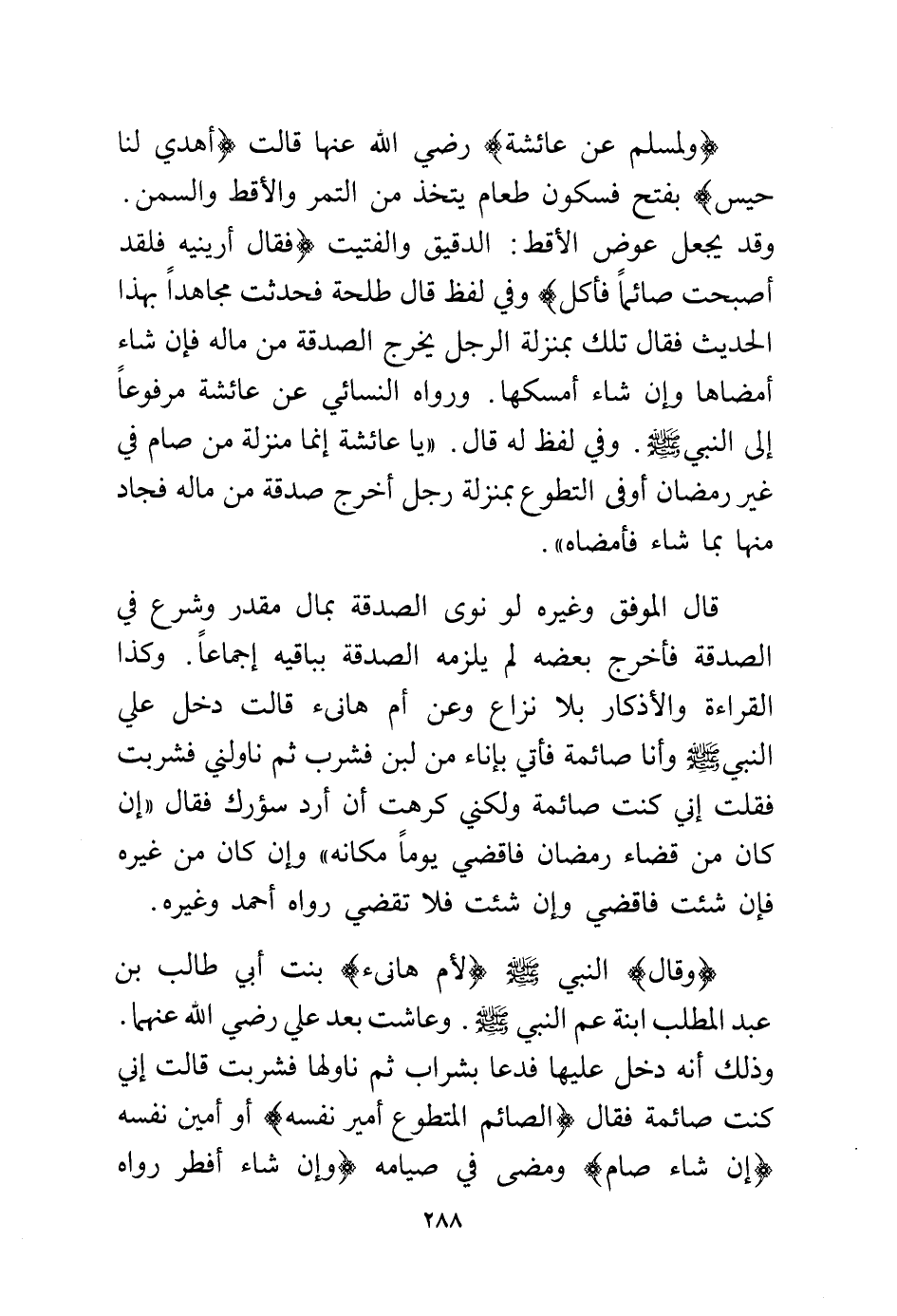 (ولمسلم عن عائشة) رضي الله عنها قالت (أهدي لنا حيس) بفتح فسكون طعام يتخذ من التمر والأقط والسمن. وقد يجعل عوض الأقط: الدقيق والفتيت (فقال أرينيه فلقد أصبحت صائما فأكل) وفي لفظ قال طلحة فحدثت مجاهدًا بهذا الحديث فقال تلك بمنزلة الرجل يخرج الصدقة من ماله فإن شاء أمضاها وإن شاء أمسكها. ورواه النسائي عن عائشة مرفوعا إلى النبي - صلى الله عليه وسلم -. وفي لفظ له قال. "يا عائشة إنما منزلة من صام في غير رمضان أو في التطوع بمنزلة رجل أخرج صدقة من ماله فجاد منها بما شاء فأمضاه".