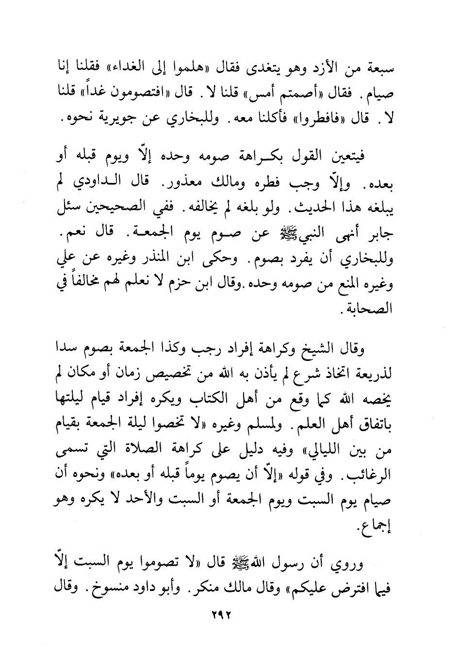 وقال الشيخ وكراهة إفراد رجب وكذا الجمعة بصوم سدا لذريعة اتخاذ شرع لم يأذن به الله من تخصيص زمان أو مكان لم يخصه الله كما وقع من أهل الكتاب ويكره إفراد قيام ليلتها باتفاق أهل العلم. ولمسلم وغيره "لا تخصوا ليلة الجمعة بقيام من بين الليالي" وفيه دليل على كراهة الصلاة التي تسمى الرغائب. وفي قوله "إلا أن يصوم يوما قبله أو بعده" ونحوه أن صيام يوم السبت ويوم الجمعة أو السبت والأحد لا يكره وهو إجماع.