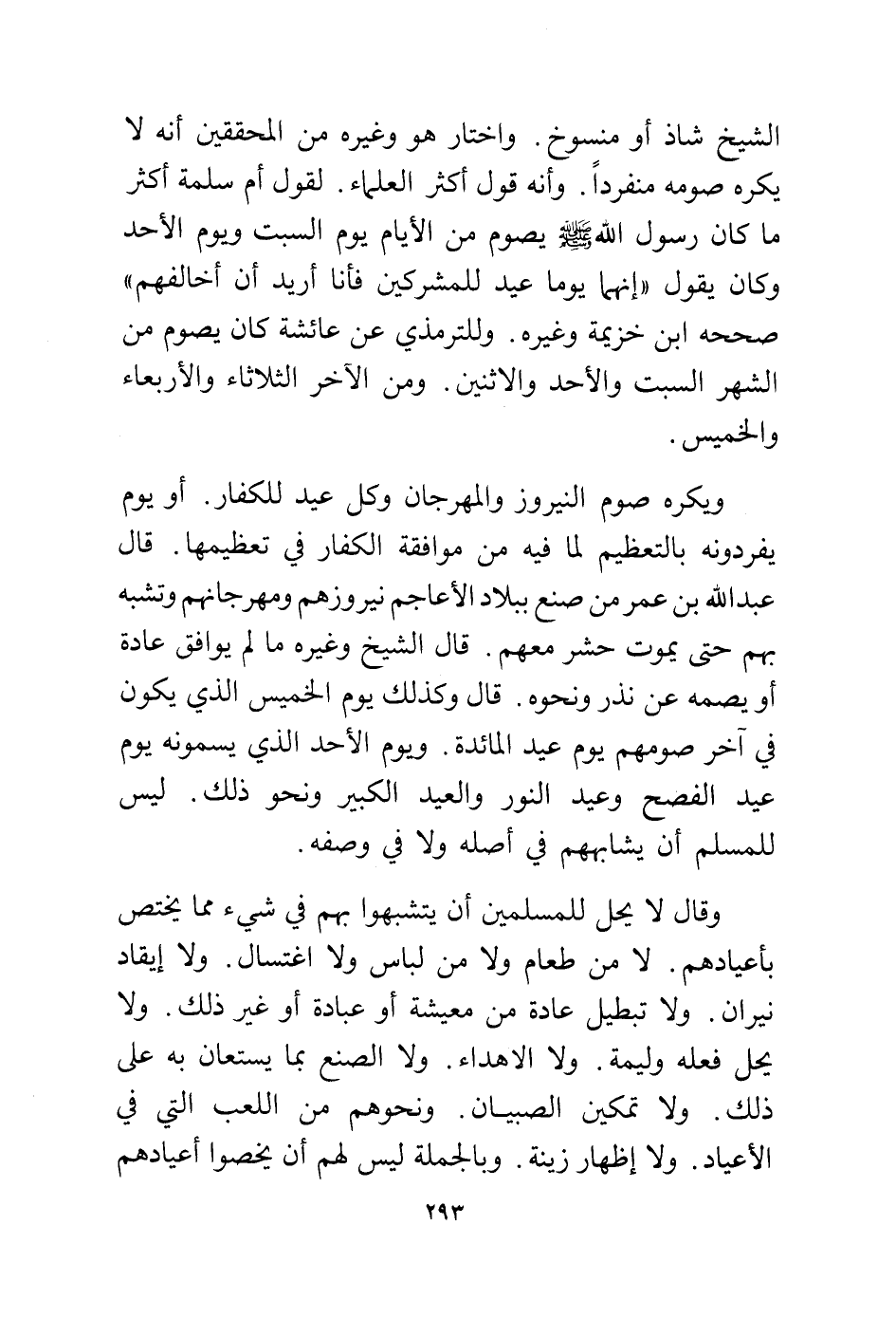 ويكره صوم النيروز والمهرجان وكل عيد للكفار. أو يوم يفردونه بالتعظيم لما فيه من موافقة الكفار في تعظيمها. قال عبد الله بن عمر من صنع ببلاد الأعاجم نيروزهم ومهرجانهم وتشبه بهم حتى يموت حشر معهم. قال الشيخ وغيره ما لم يوافق عادة أو يصمه عن نذر ونحوه. قال وكذلك يوم الخميس الذي يكون في آخر صومهم يوم عيد المائدة. ويوم الأحد الذي يسمونه يوم عيد الفصح وعيد النور والعيد الكبير ونحو ذلك. ليس للمسلم أن يشابههم في أصله ولا في وصفه.