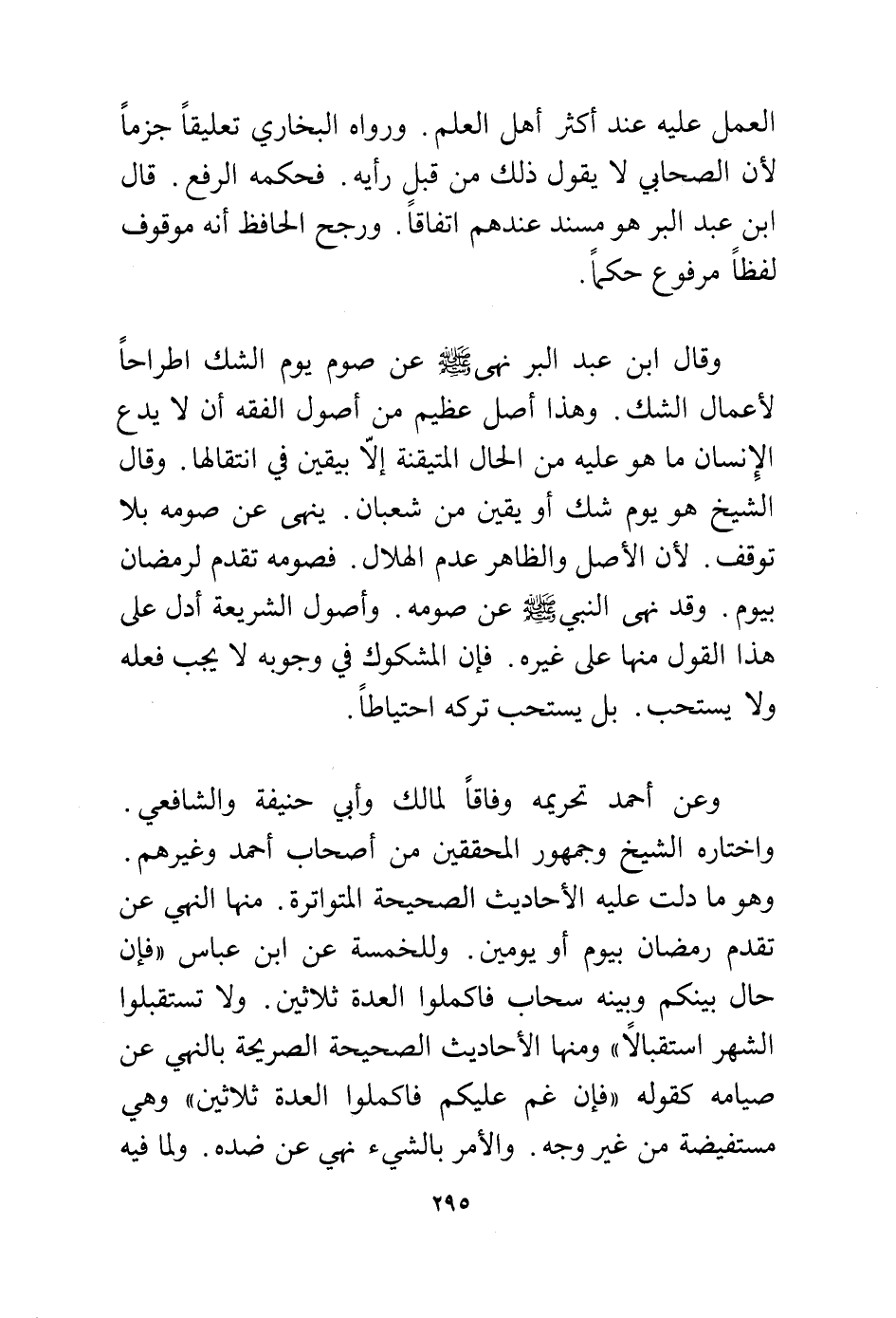 وقال ابن عبد البر نهى - صلى الله عليه وسلم - عن صوم يوم الشك اطراحًا لأعمال الشك. وهذا أصل عظيم من أصول الفقه أن لا يدع الإنسان ما هو عليه من الحال المتيقنة إلا بيقين في انتقالها. وقال الشيخ هو يوم شك أو يقين من شعبان. ينهى عن صومه بلا توقف. لأن الأصل والظاهر عدم الهلال. فصومه تقدم لرمضان بيوم. وقد نهى النبي - صلى الله عليه وسلم - عن صومه. وأصول الشريعة أدل على هذا القول منها على غيره. فإن المشكوك في وجوبه لا يجب فعله ولا يستحب. بل يستحب تركه احتياطا.