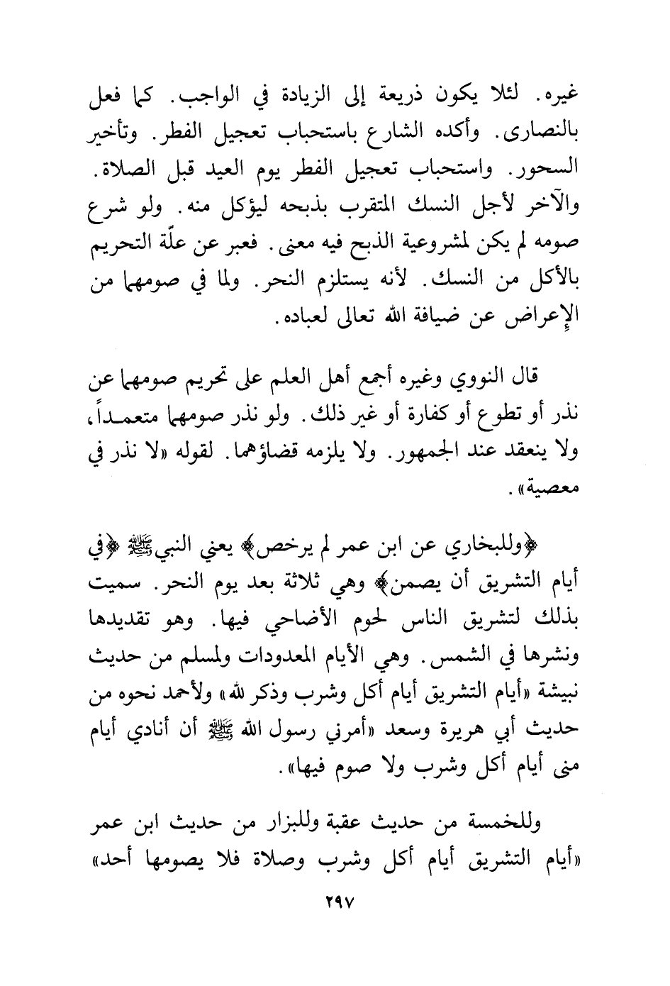 غيره. لئلا يكون ذريعة إلى الزيادة في الواجب. كما فعل بالنصارى. وأكده الشارع باستحباب تعجيل الفطر. وتأخير السحور. واستحباب تعجيل الفطر يوم العيد قبل الصلاة. والآخر لأجل النسك المتقرب بذبحه ليؤكل منه. ولو شرع صومه لم يكن لمشروعية الذبح فيه معنى. فعبر عن علة التحريم بالأكل من النسك. لأنه يستلزم النحر. ولما في صومهما من الإعراض عن ضيافة الله تعالى لعباده.