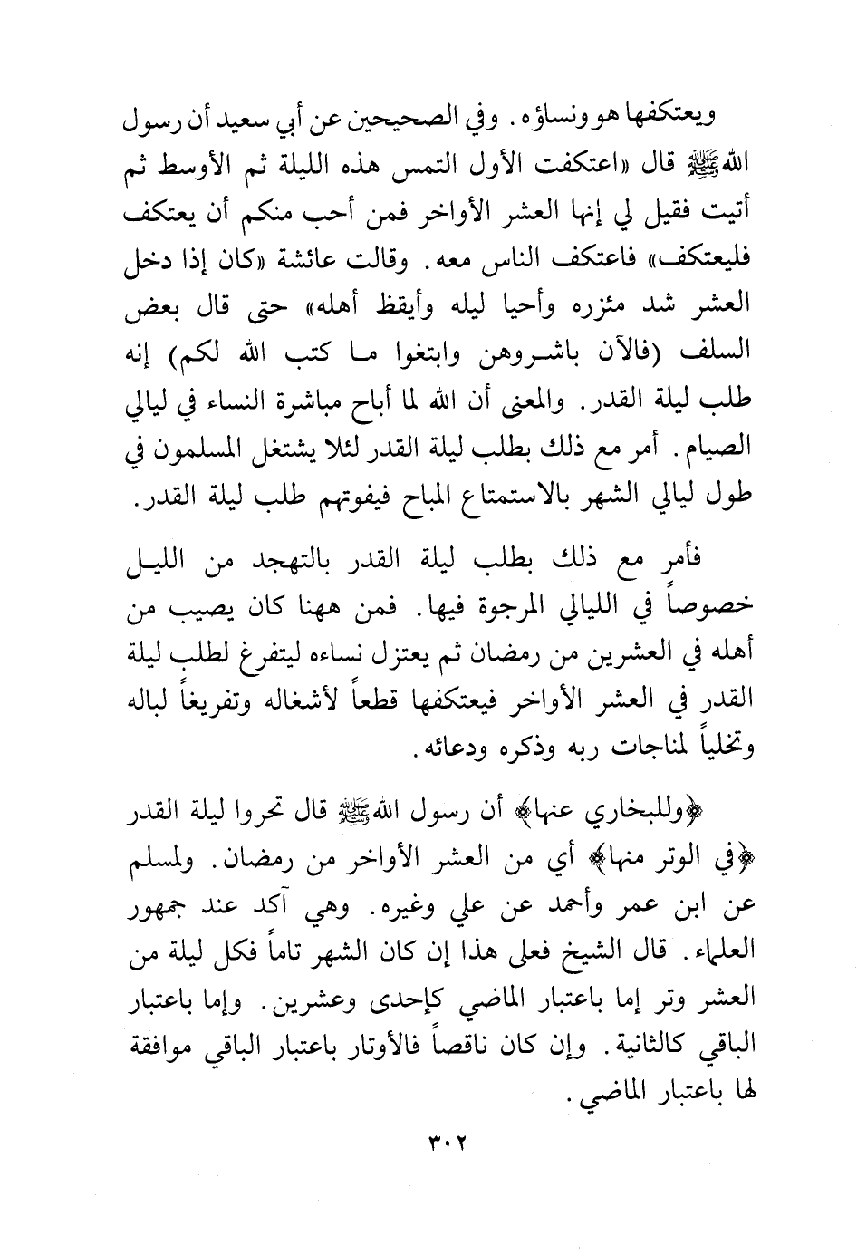ويعتكفها هو ونساؤه. وفي الصحيحين عن أبي سعيد أن رسول الله - صلى الله عليه وسلم - قال "اعتكفت الأول التمس هذه الليلة ثم الأوسط ثم أتيت فقيل لي إنها العشر الأواخر فمن أحب منكم أن يعتكف فليعتكف" فاعتكف الناس معه. وقالت عائشة "كان إذا دخل العشر شد مئزره وأحيا ليله وأيقظ أهله" حتى قال بعض السلف {فَالْآنَ بَاشِرُوهُنَّ وَابْتَغُوا مَا كَتَبَ اللَّهُ لَكُمْ} إنه طلب ليلة القدر. والمعنى أن الله لما أباح مباشرة النساء في ليالي الصيام. أمر مع ذلك بطلب ليلة القدر لئلا يشتغل المسلمون في طول ليالي الشهر بالاستمتاع المباح فيفوتهم طلب ليلة القدر.