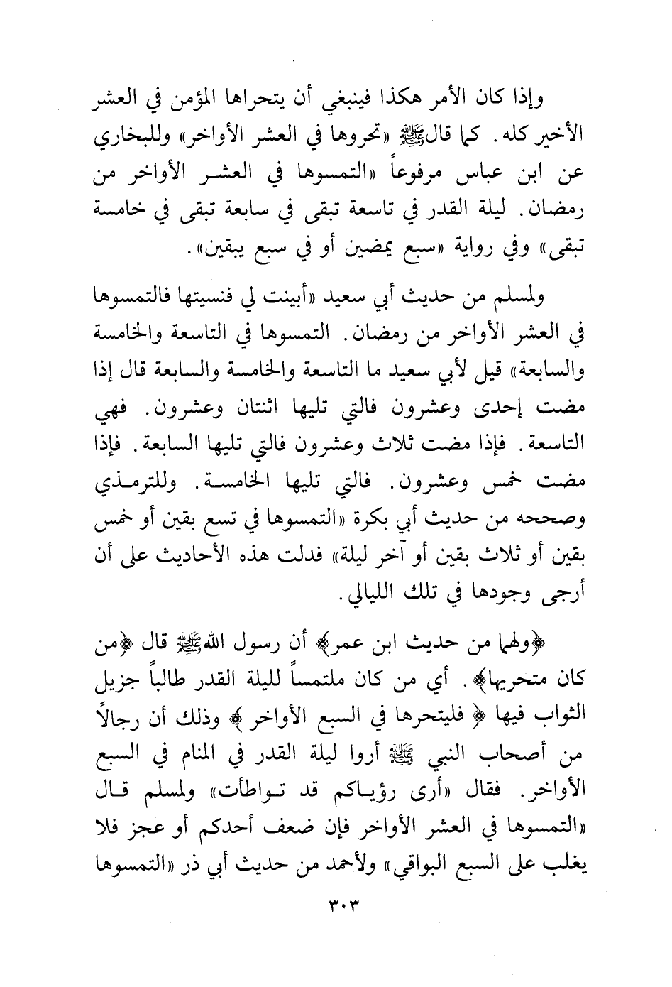 وإذا كان الأمر هكذا فينبغي أن يتحراها المؤمن في العشر الأخير كله. كما قال - صلى الله عليه وسلم - "تحروها في العشر الأواخر" وللبخاري عن ابن عباس مرفوعا "التمسوها في العشر الأواخر من رمضان. ليلة القدر في تاسعة تبقى في سابعة تبقى في خامسة تبقى" وفي رواية "سبع يمضين أو في سبع يبقين".