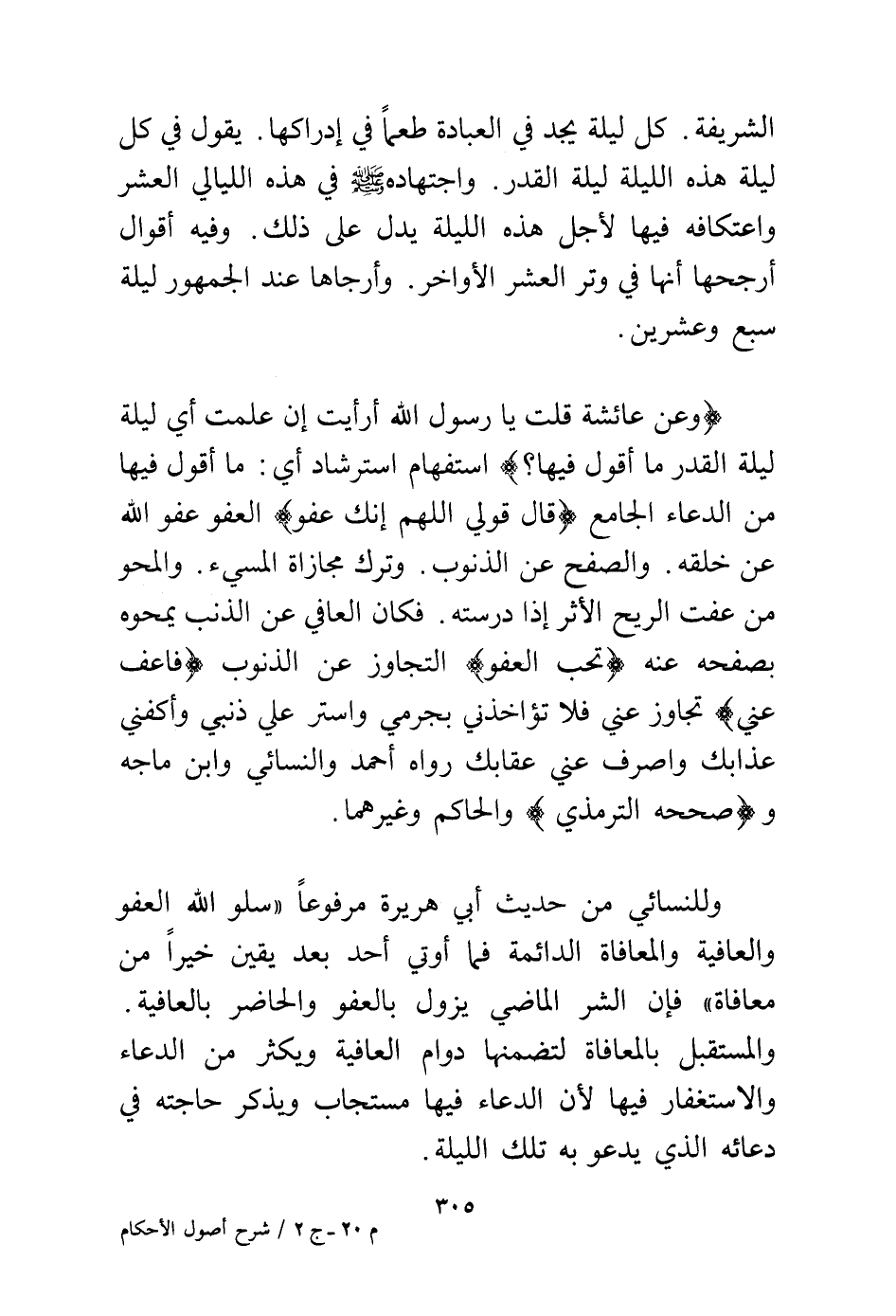 (وعن عائشة قلت يا رسول الله أرأيت إن علمت أي ليلة ليلة القدر ما أقول فيها؟) استفهام استرشاد أي: ما أقول فيها من الدعاء الجامع (قال قولي اللهم إنك عفو) العفو عفو الله عن خلقه. والصفح عن الذنوب. وترك مجازاة المسيء. والمحو من عفت الريح الأثر إذا درسته. فكان العافي عن الذنب يمحوه بصفحه عنه (تحب العفو) التجاوز عن الذنوب (فاعف عني) تجاوز عني فلا تؤاخذني بجرمي واستر على ذنبي وأكفني عذابك واصرف عني عقابك رواه أحمد والنسائي وابن ماجه و (صححه الترمذي) والحاكم وغيرهما.