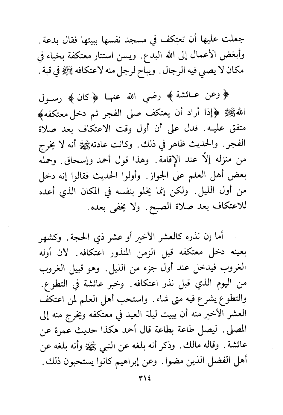 (وعن عائشة) رضي الله عنها (كان) رسول الله - صلى الله عليه وسلم - (إذا اراد أن يعتكف صلى الفجر ثم دخل معتكفه) متفق عليه. فدل على أن أول وقت الاعتكاف بعد صلاة الفجر. والحديث ظاهر في ذلك وكانت عادته - صلى الله عليه وسلم - أنه لا يخرج من منزله إلا عند الإقامة. وهذا قول أحمد وإسحاق. وحمله بعض أهل العلم على الجواز. وأولوا الحديث فقالوا إنه دخل من أول الليل. ولكن إنما يخلو بنفسه في المكان الذي أعده للاعتكاف بعد صلاة الصبح. ولا يخفى بعده.