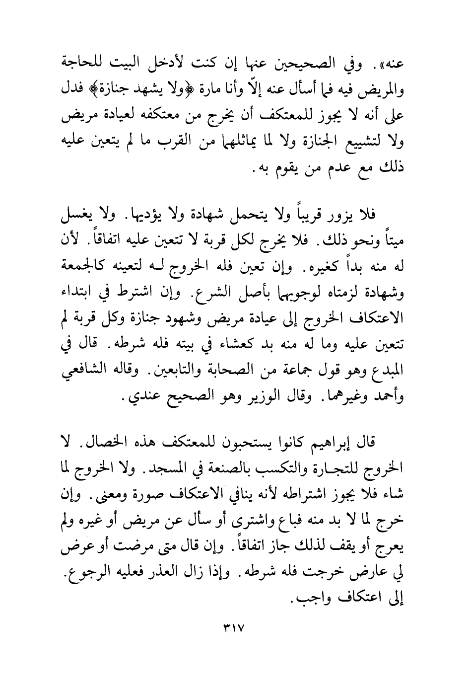 قال إبراهيم كانوا يستحبون للمعتكف هذه الخصال. لا الخروج للتجارة والتكسب بالصنعة في المسجد. ولا الخروج لما شاء فلا يجوز اشتراطه لأنه ينافي الاعتكاف صورة ومعنى. وإن خرج لما لا بد منه فباع واشترى أو سأل عن مريض أو غيره ولم يعرج أو يقف لذلك جاز اتفاقا. وإن قال متى مرضت أو عرض لي عارض خرجت فله شرطه. وإذا زال العذر فعليه الرجوع. إلى اعتكاف واجب.
