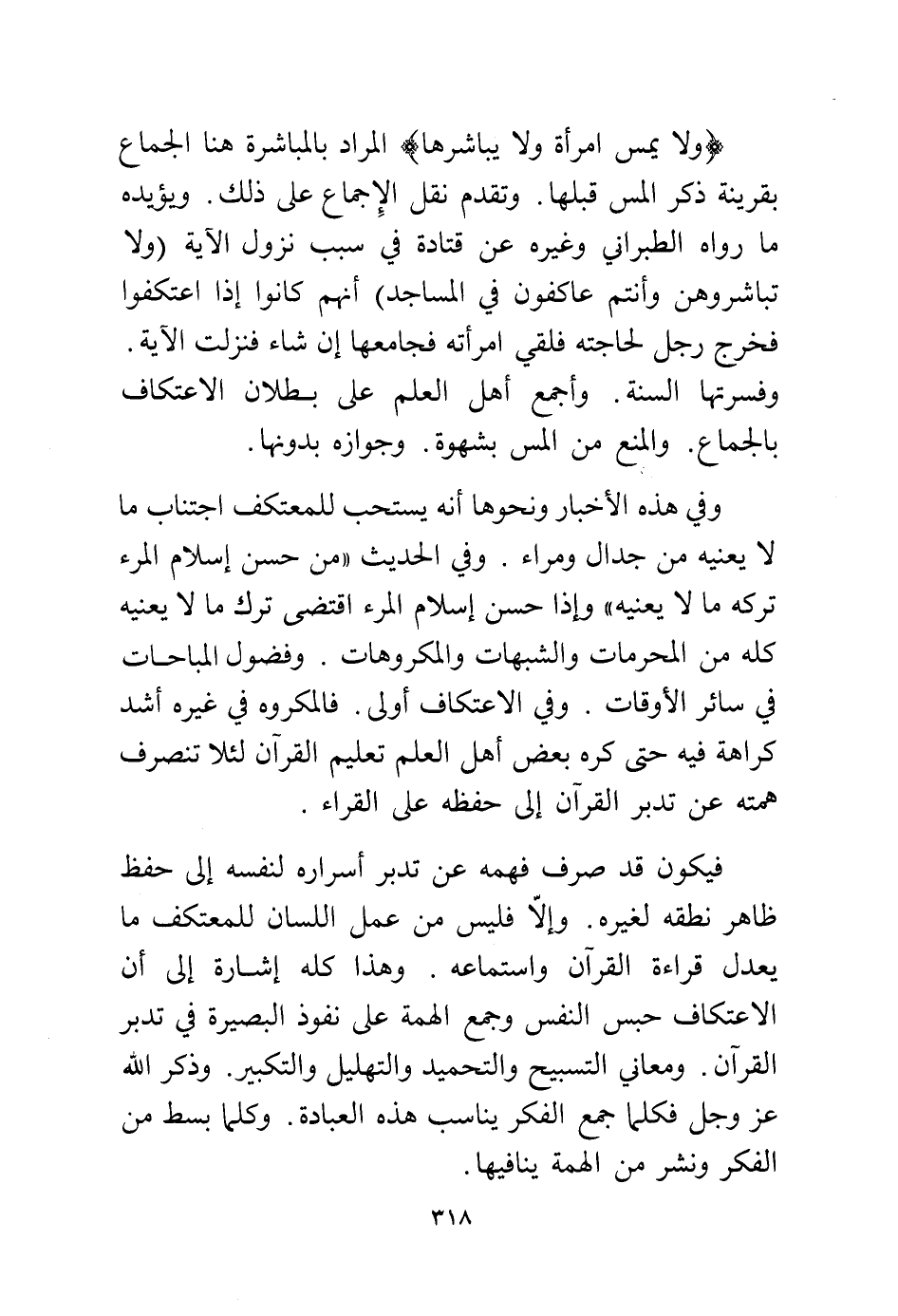 (ولا يمس امرأة ولا يباشرها) المارد بالمباشرة هنا الجماع قرينة ذكر المس قبلها. وتقدم نقل الإجماع على ذلك. ويؤديه ما رواه الطبراني وغيره عن قتادة في سبب نزول الآية {وَلَا تُبَاشِرُوهُنَّ وَأَنْتُمْ عَاكِفُونَ فِي الْمَسَاجِدِ} أنهم كانوا إذا اعتكفوا فخرج رجل لحاجته فلقي امرأته فجامعها إن شاء فنزلت الآية. وفسرتها السنة. وأجمع أهل العلم على بطلان الاعتكاف بالجماع. والمنع من المس بشهوة. وجوازه بدونها.