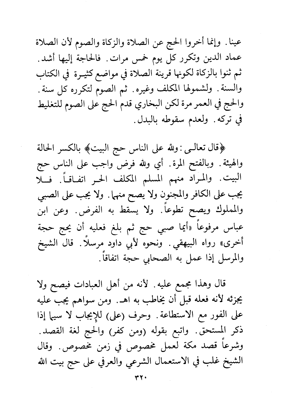 قال تعالى: {وَلِلَّهِ عَلَى النَّاسِ حِجُّ الْبَيْتِ} بالكسر الحالة والهيئة. وبالفتح المرة. اي ولله فرض واجب على الناس حج البيت. والمراد منهم المسلم المكلف الحر اتفاقا. فلا يجب على الكافر والمجنون ولا يصح منهما. ولا يجب على الصبي والمملوك ويصح تطوعا. ولا يسقط به الفرض. وعن ابن عباس مرفوعا "أيما صبي حج ثم بلغ فعليه أن يحج حجة أخرى" رواه البيهقي. ونحوه لأبي داود مرسلا. قال الشيخ والمرسل إذا عمل به الصحابي حجة اتفاقا.
