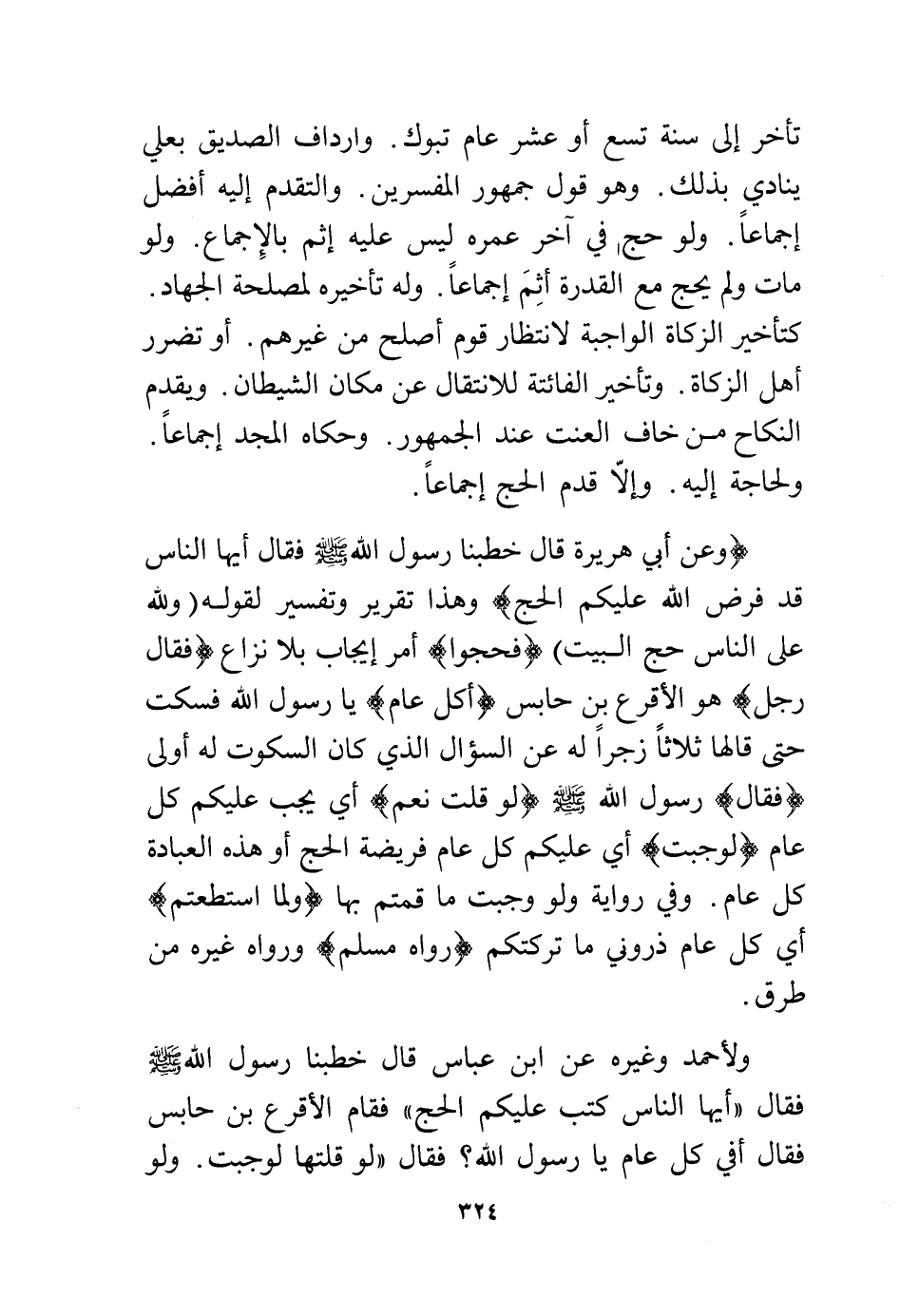 ولأحمد وغيره عن ابن عباس قال خطبنا رسول الله - صلى الله عليه وسلم - فقال "أيها الناس كتب عليكم الحج" فقام الأقرع بن حابس فقال أفي كل عام يا رسول الله؟ فقال "لو قلتها لوجبت. ولو
