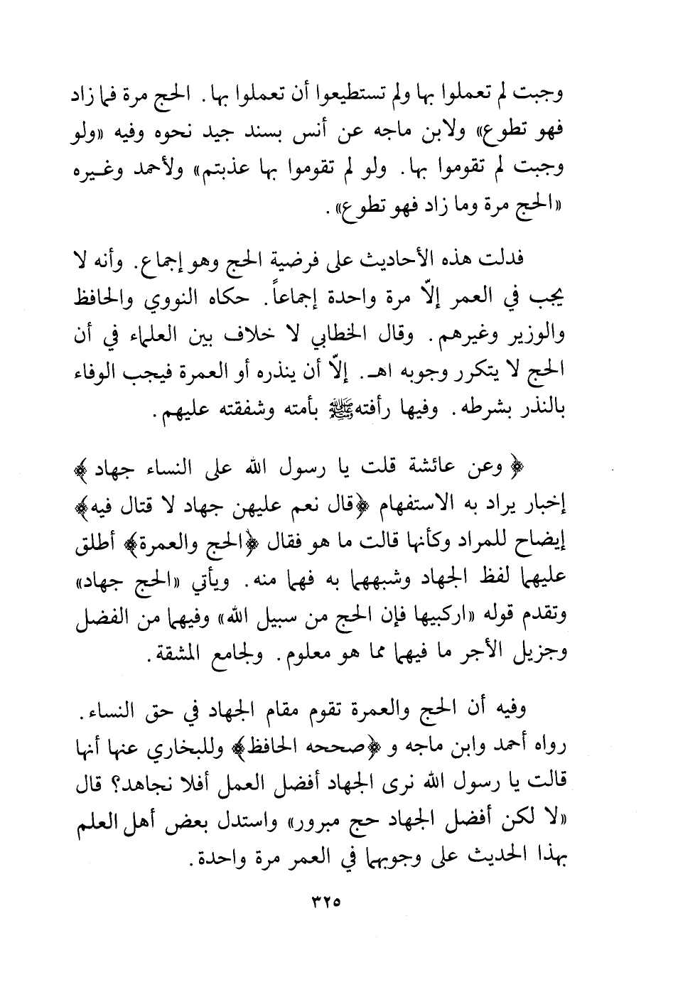وفيه أن الحج والعمرة تقوم مقام الجهاد في حق النساء. رواه أحمد وابن ماجه و (صححه الحافظ) وللبخاري عنها أنها قالت يا رسول الله نرى الجهاد أفضل العمل أفلا نجاهد؟ قال "لا لكن أفضل الجهاد حج مبرور" واستدل بعض أهل العلم بهذا الحديث على وجوبهما في العمر مرة واحدة.
