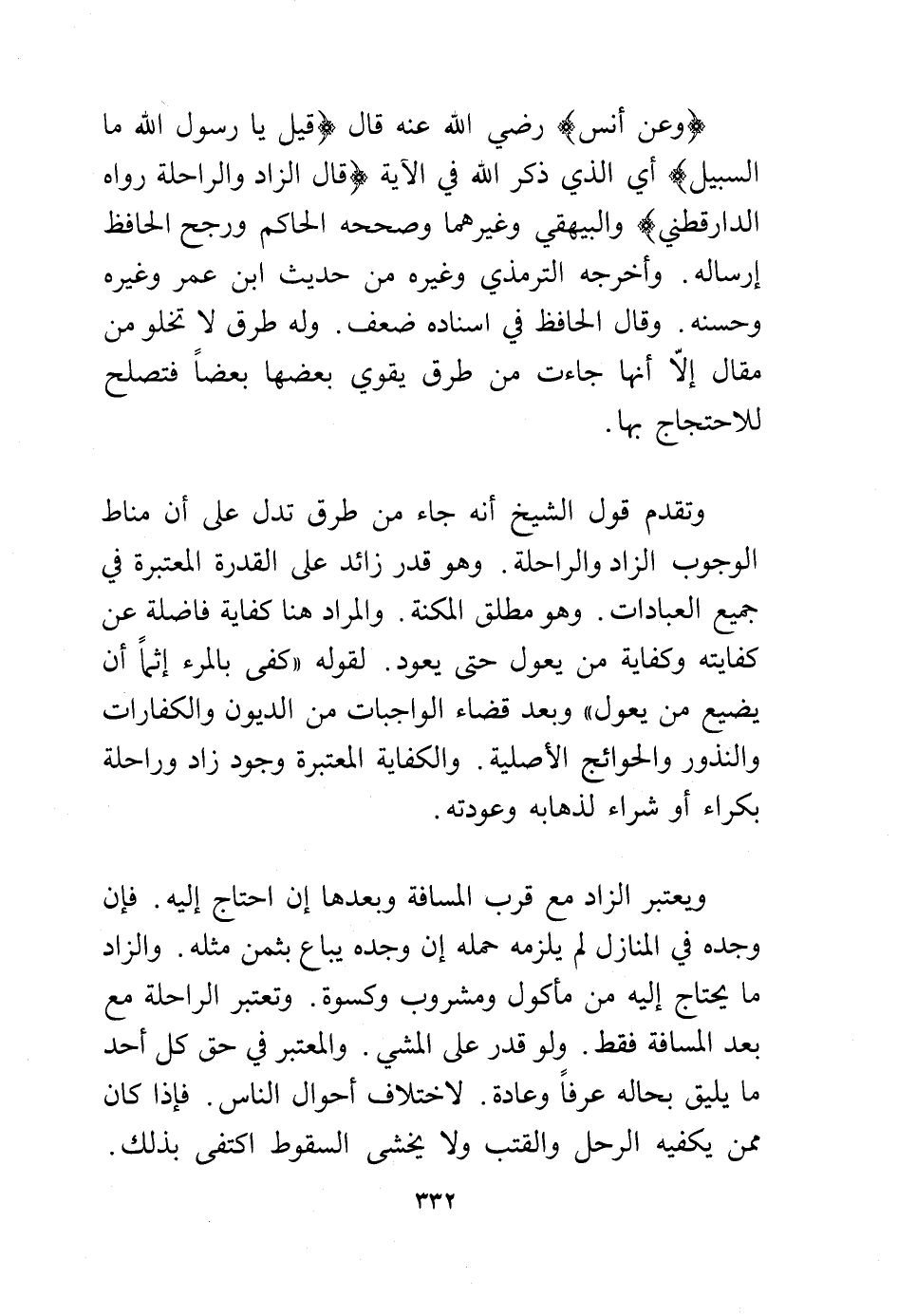 وتقدم قول الشيخ أنه جاء من طرق تدل على أن مناط الوجوب الزاد والراحلة. وهو قدر زائد على القدرة المعتبرة في جميع العبادات. وهو مطلق المكنة. والمراد هنا كفاية فاضلة عن كفايته وكفاية من يعول حتى يعود. لقوله "كفى بالمرء إثما أن يضيع من يعول" وبعد قضاء الواجبات من الديون والكفارات والنذور والحوائج الأصلية. والكفاية المعتبرة وجود زاد وراحلة بكراء أو شراء لذهابه وعودته.
