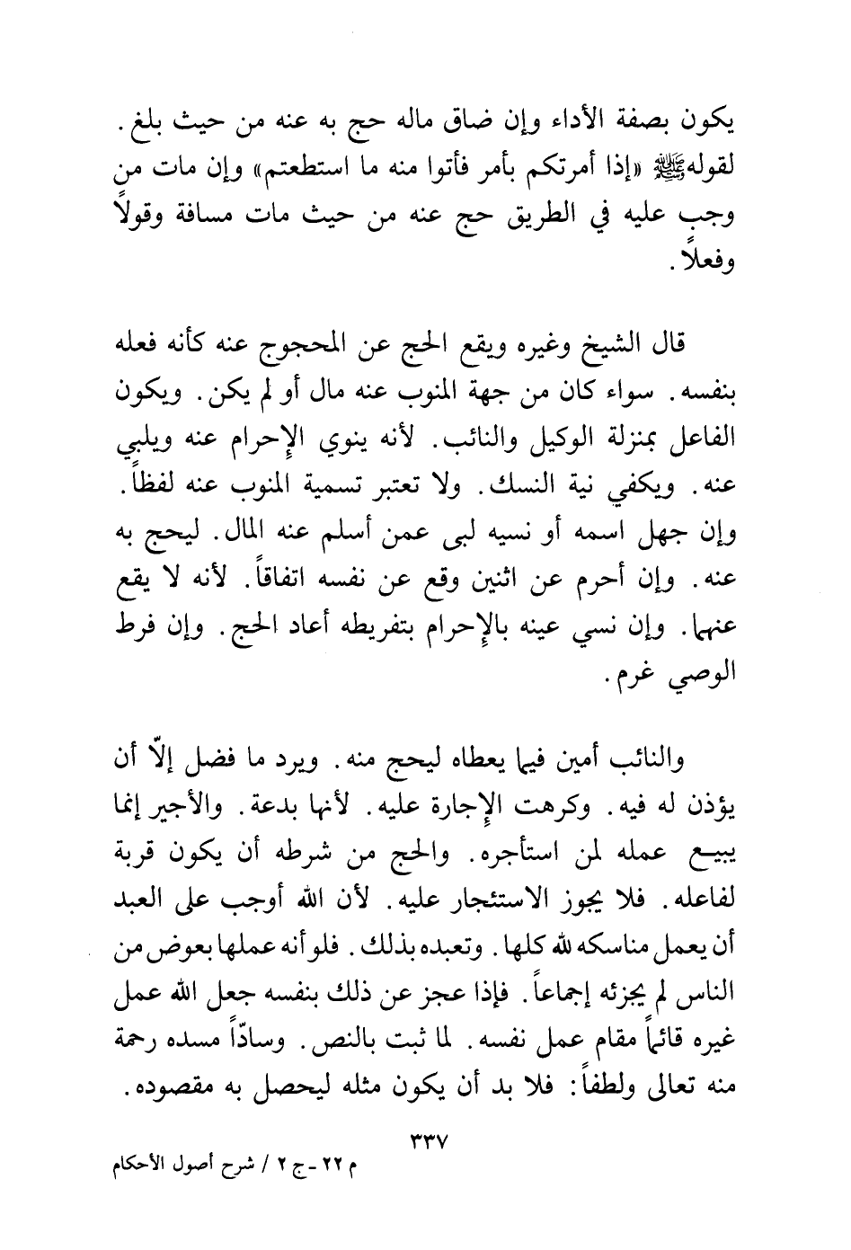 قال الشيخ وغيره ويقع الحج عن المحجوج عنه كأنه فعله بنفسه. سواء كان من جهة المنوب عنه مال أو لم يكن. ويكون الفاعل بمنزلة الوكيل والنائب. لأنه ينوي الإجرام عنه ويلبي عنه. ويكفي نية النسك. ولا تعتبر تسمية المنوب عنه لفظا. وإن جهل اسمه أو نسيه لبى عمن أسلم عنه المال. ليحج به عنه. وإن أحرم عن اثنين وقع عن نفسه اتفاقا. لأنه لا يقع عنهما. وإن نسي عينه بالإحرام بتفريطه أعاد الحج. وإن فرط الوصي غرم.