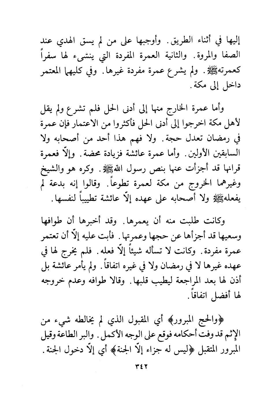 وأما عمرة الخارج منها إلى أدنى الحل فلم تشرع ولم يقل لأهل مكة اخرجوا إلى أدنى الحل فأكثروا من الاعتمار فإن عمرة في رمضان تعدل حجة. ولا فهم هذا أحد من أصحابه ولا السابقين الأولين. وأما عمرة عائشة فزيادة محضة. وإلا فعمرة قرانها قد أجزأت عنها بنص رسول الله - صلى الله عليه وسلم -. وكره هو والشيخ وغيرهما الخروج من مكة لعمرة تطوعًا. وقالوا إنه بدعة لم يفعله - صلى الله عليه وسلم - ولا أصحابه على عهده إلا عائشة تطييبا لنفسها.